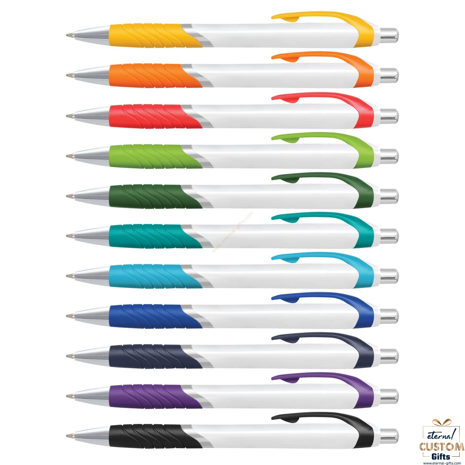 Retractable plastic ballpoint pen with a white barrel, a soft-touch grip and shiny chrome trim. It has a black or blue refill with 1200 metres of German manufactured Dokumental ink and can be presented in an optional pen sleeve.