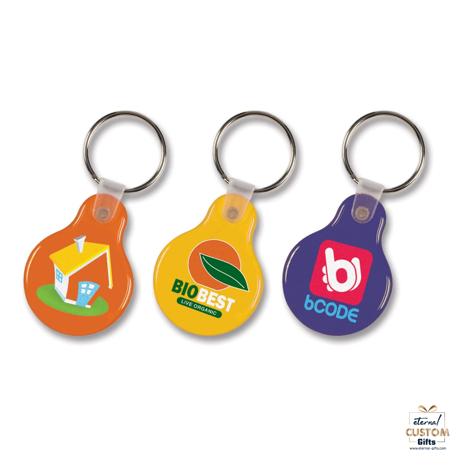 Flexible key ring with a durable resin coated finish which can be printed in spot colour or full colour on both sides at no extra cost.
