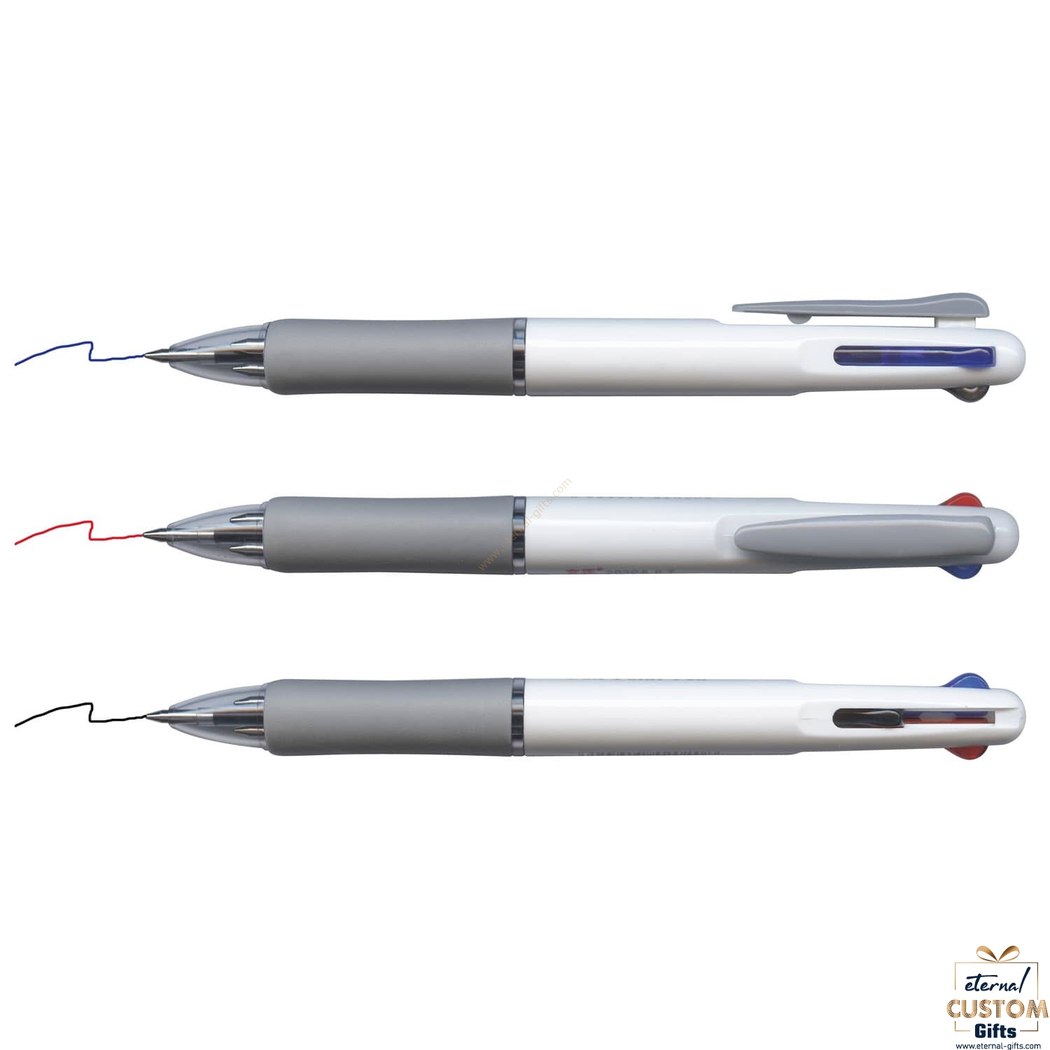 Retractable plastic ballpoint pen with a soft rubber grip and three different coloured refills. It has red, blue and black refills all of which have 500 metres of writing ink with a stainless steel ball and it can be presented in an optional pen sleeve.