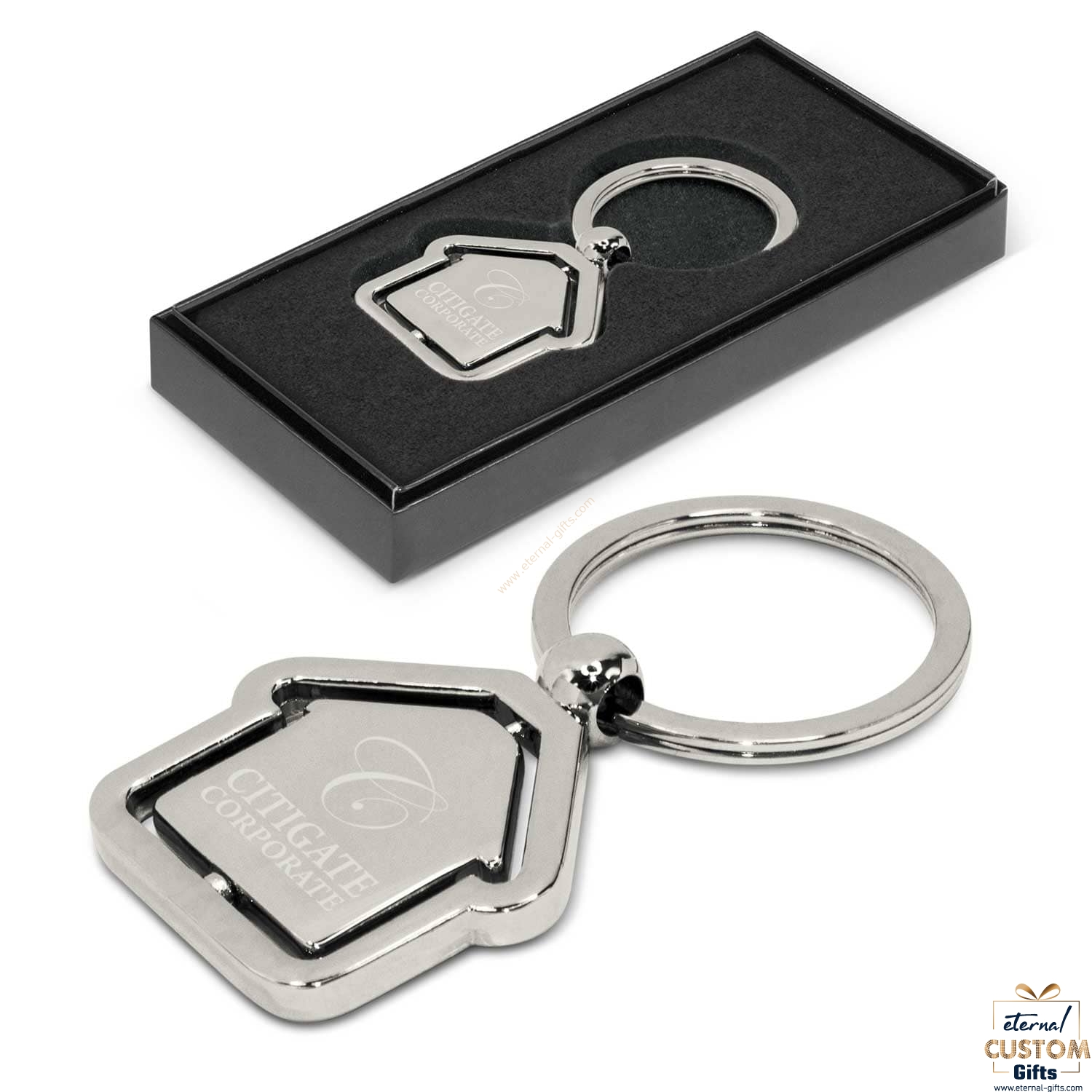 Shiny chrome metal key ring with a rotating house-shaped inner part. It laser engraves to a natural etch on one or both sides and is nicely presented in a black gift box.