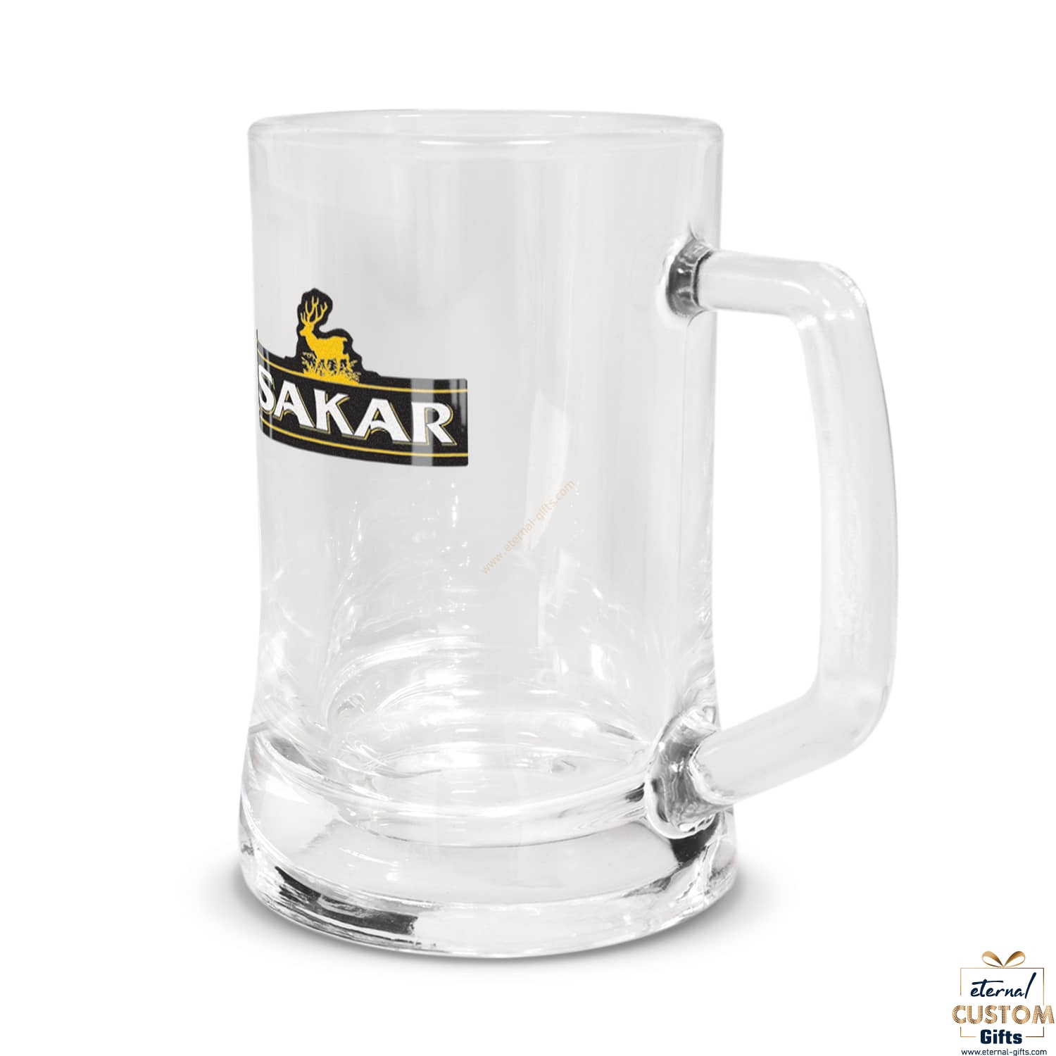 Solid 400ml glass beer mug which can be presented in an optional black gift box. This product is not dishwasher safe and handwashing is recommended.