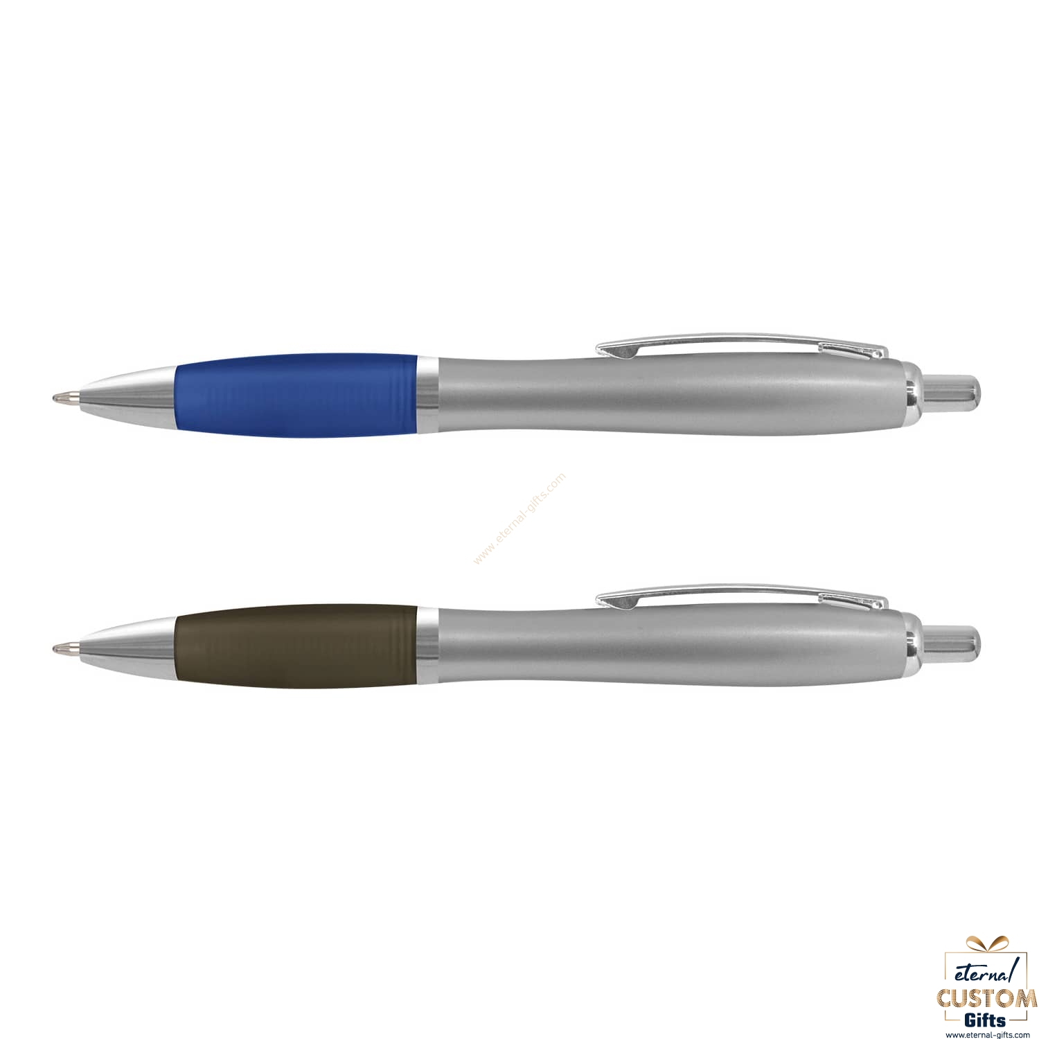 • Retractable plastic ballpoint pen with a metallic silver barrel