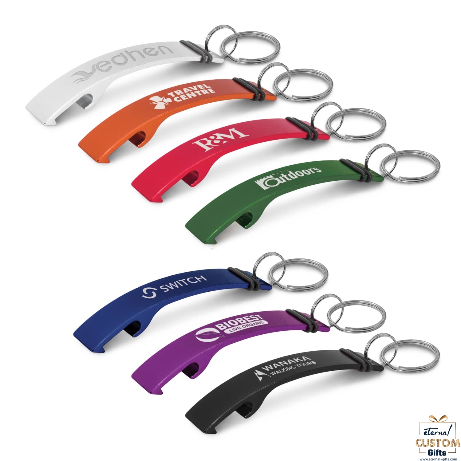 Robust aluminium bottle opener with two decorative rubber accents and a key ring. It laser engraves to an oxidised white colour.
