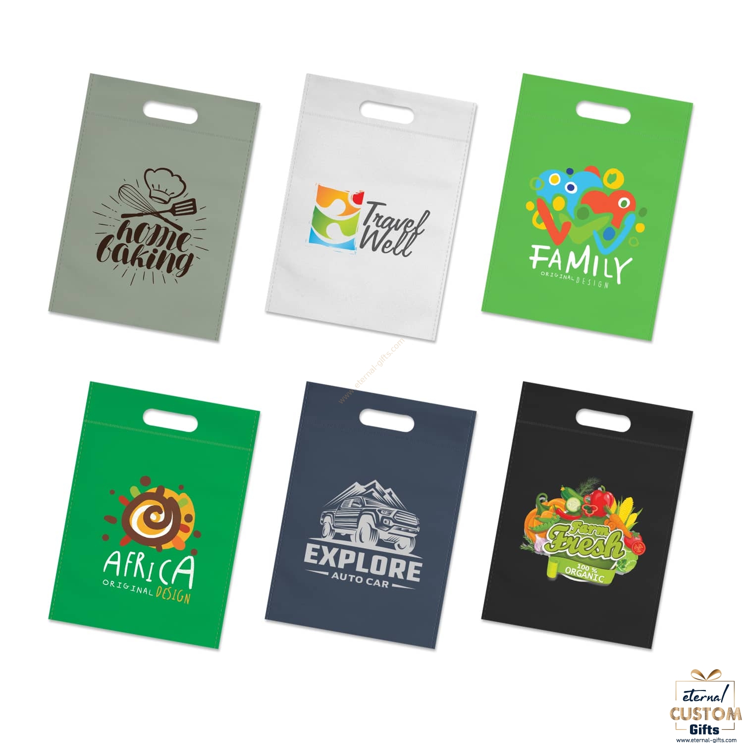 Small heat-sealed tote bag with die cut hand grips which is designed to hold A4 documents and catalogues etc. It is manufactured from 80gsm non-woven polypropylene material.