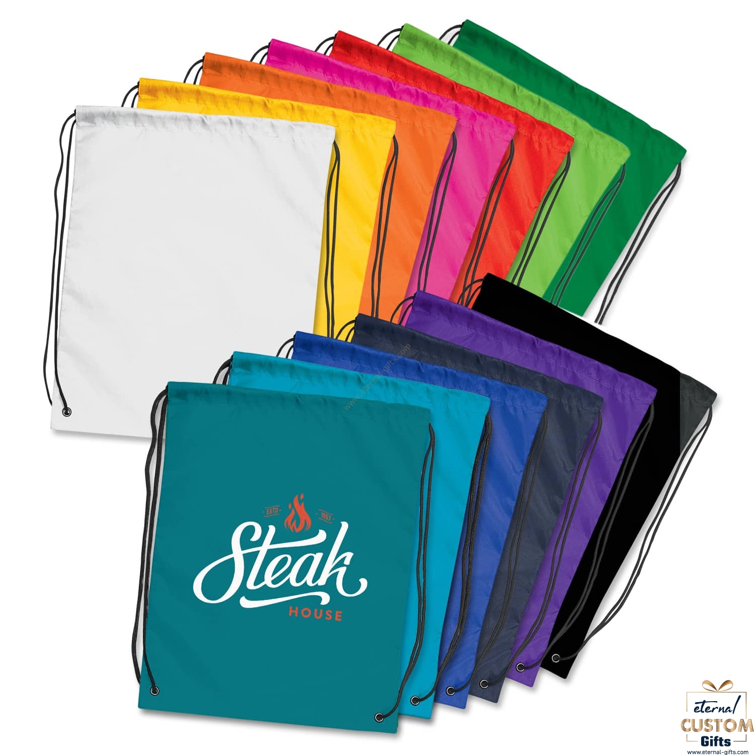 Affordable drawstring backpack which is manufactured from 210D polyester and has riveted metal eyelets at the base for added strength.