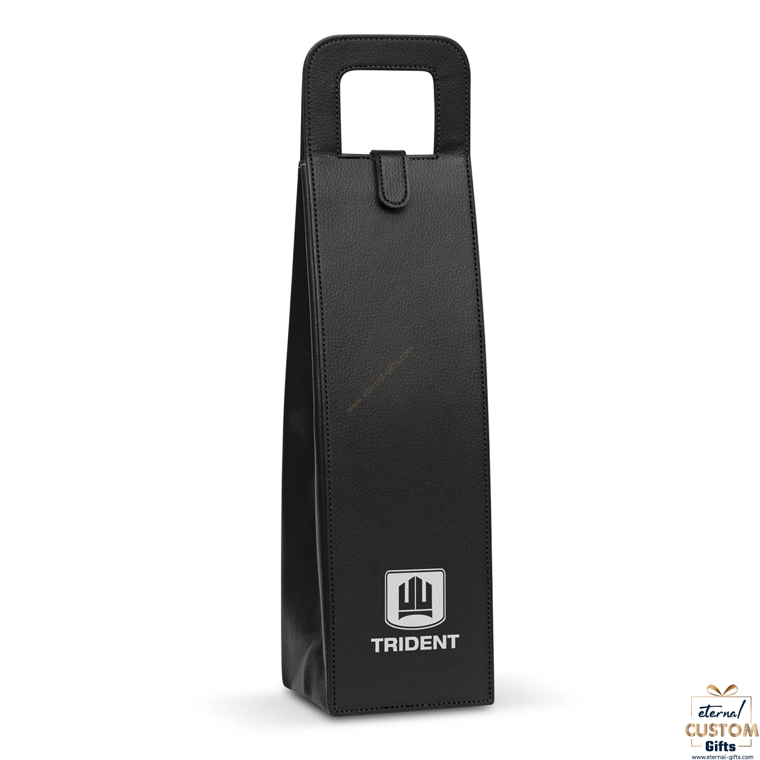 Deluxe single bottle wine carrier which is manufactured from reinforced leather-look PU. It has a domed top closure, a reinforced carry handle and folds flat when not in use.