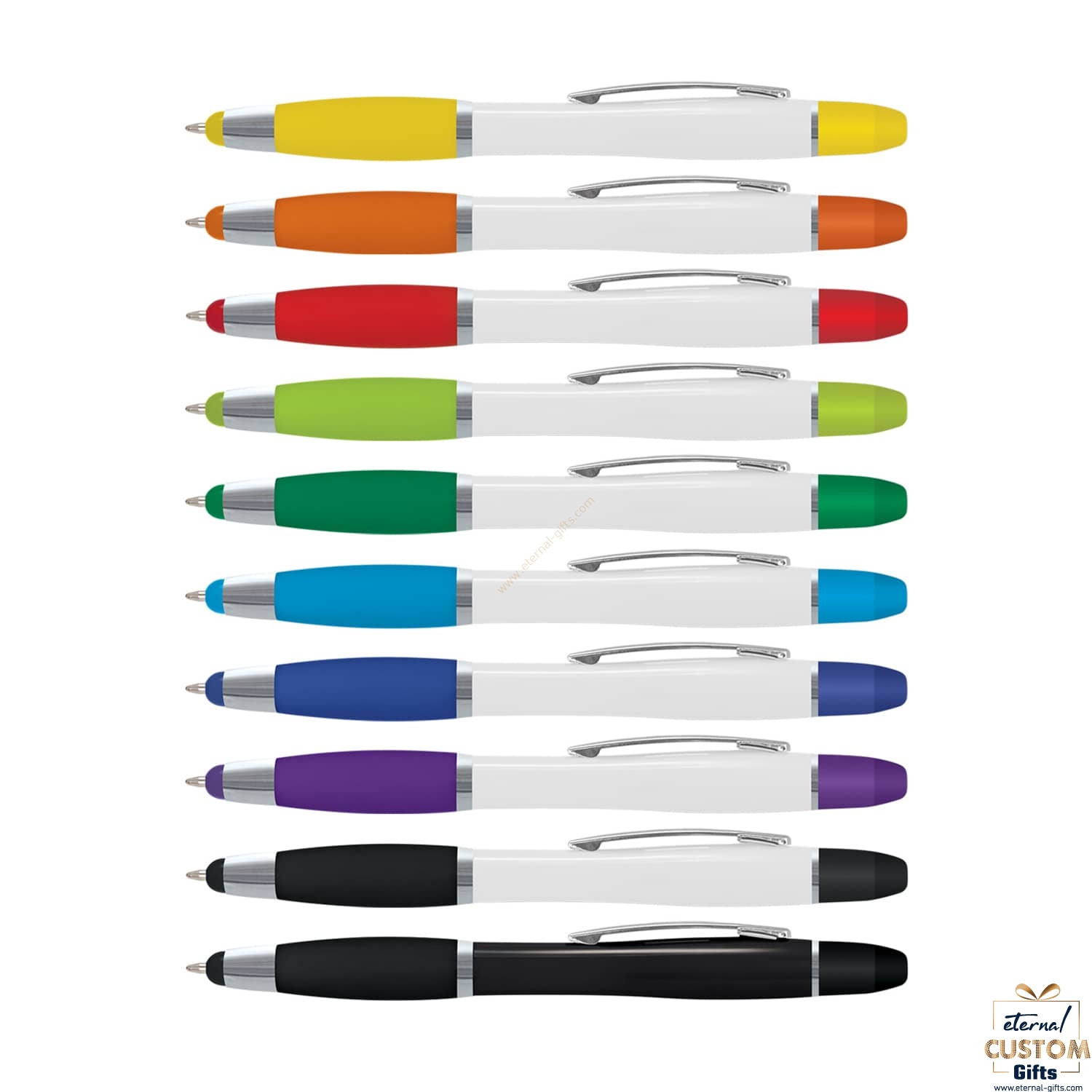 - Twist-action plastic ballpoint pen with a stylus and highlighter