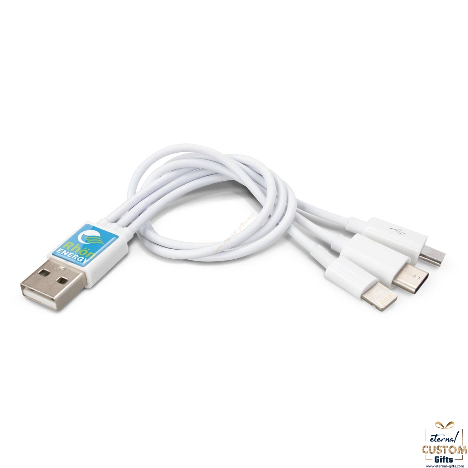 A very useful mobile accessory which is effectively three cables in one. It has a USB plug on one end with a Micro-B connector, a Lightning connector (for iPhone) and a USB Type-C connector on the other. This cable is for charging only and is not designed for data connections.
