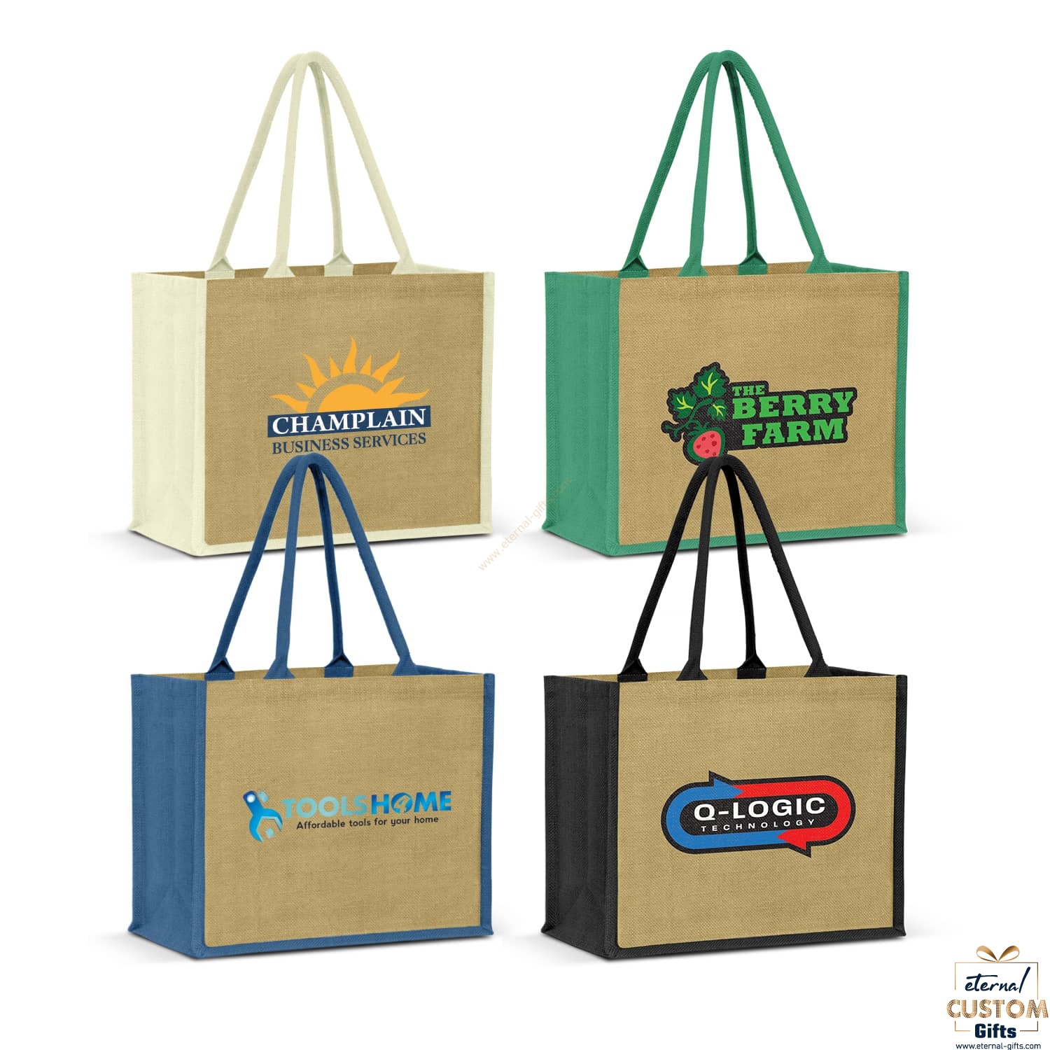 Extra-wide laminated jute tote bag with a large gusset and padded cotton handles. It is available in four colours where the gussets and handles are dyed to match.