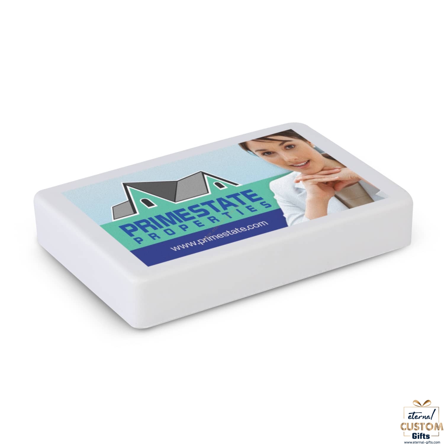 Business card shaped squeezable stress reliever made from soft polyurethane.