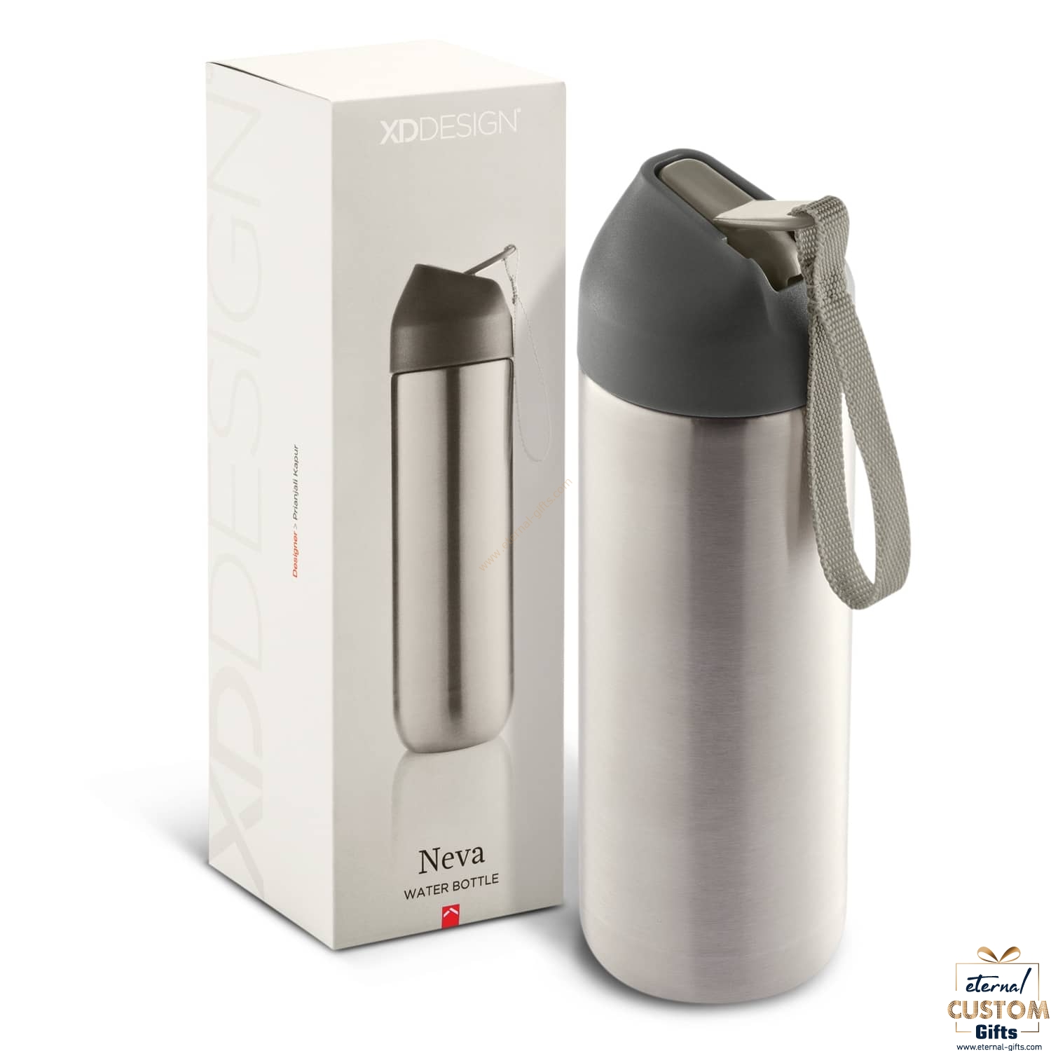 Exceptional 500ml BPA-free stainless steel water bottle from XD which has a secure screw on lid with a woven carry strap that acts as a quick release for the flip out drinking valve. The bottle laser engraves to a natural etch and is nicely presented in an XD gift box. This product is not dishwasher safe and handwashing is recommended.