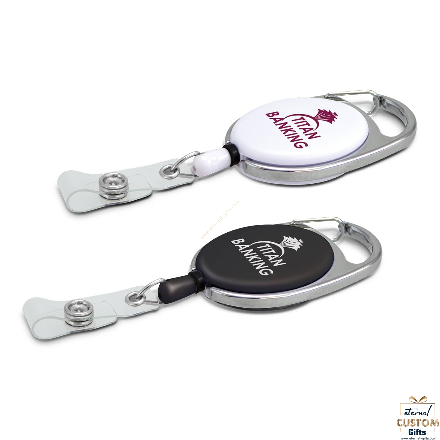 Retractable ID holder with a reliable steel spring and a standard dome attachment for holding plastic ID card holders. It has a carabiner clip and can be branded on both sides. Clear vinyl ID holders are available on request.