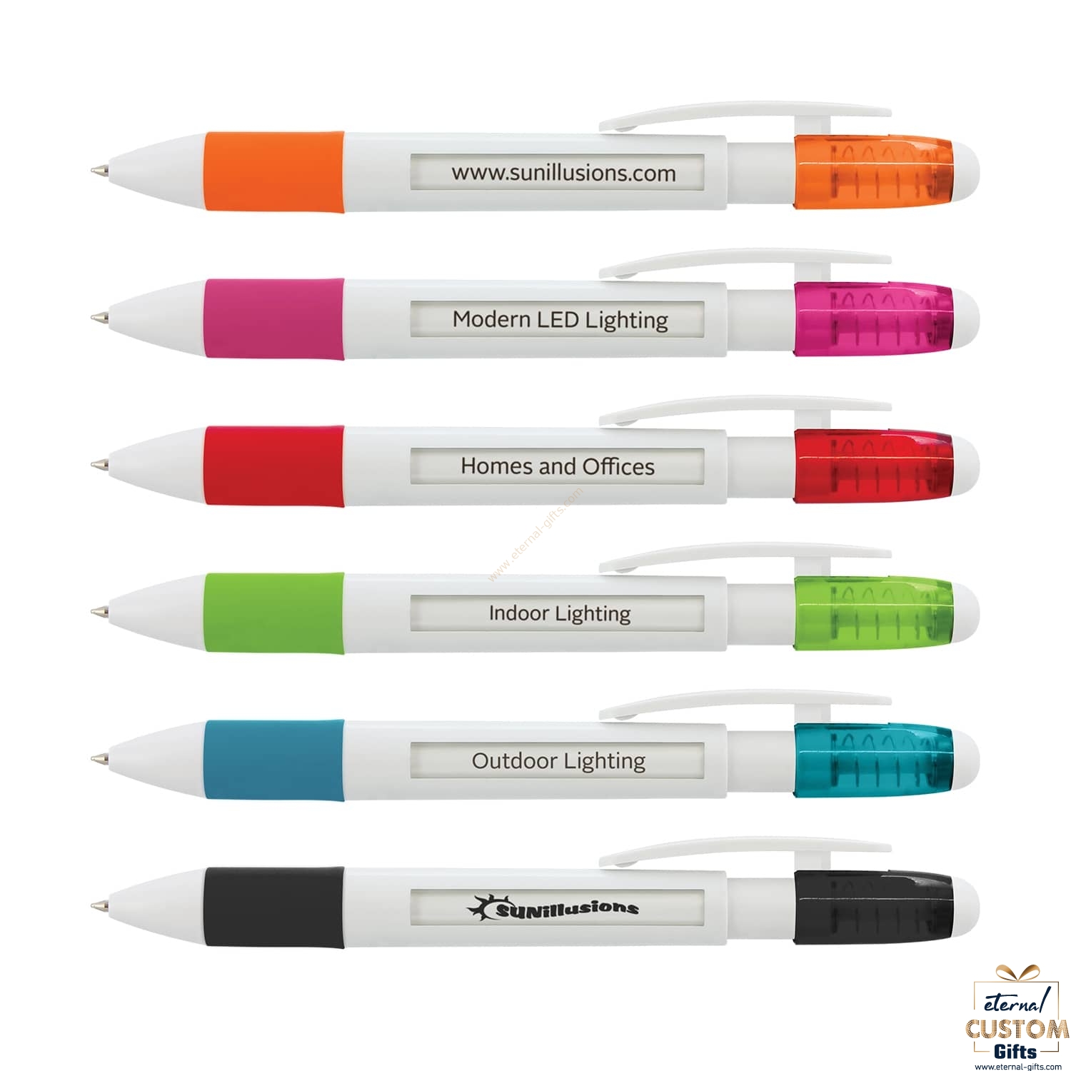 Retractable plastic ballpoint pen with a white barrel, a soft rubber grip and a rotating inner barrel which holds six different messages. Each time the push button is clicked, a new message is displayed in the two clear barrel windows. It has a blue or black refill with 1200 metres of German manufactured Dokumental ink. A production lead time of 40 working days applies to this product by air freight and orders can be sea freighted on request to reduce the freight cost.