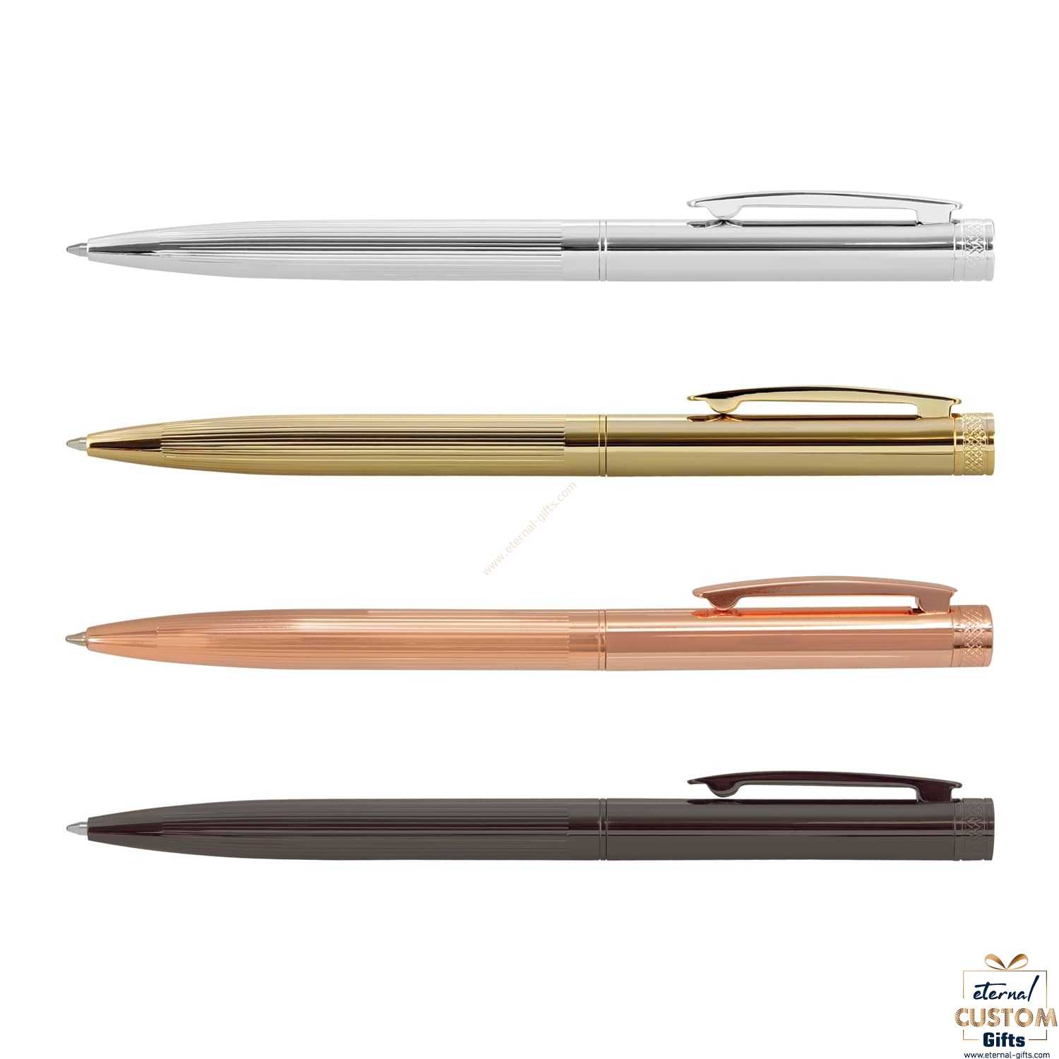 Exceptional twist-action brass ballpoint pen with a smart electroplated finish and decorative guilloche engraved lines on the lower barrel. It has a black large volume refill with 4000 metres of German manufactured Dokumental ink and can be presented in an optional pen case.