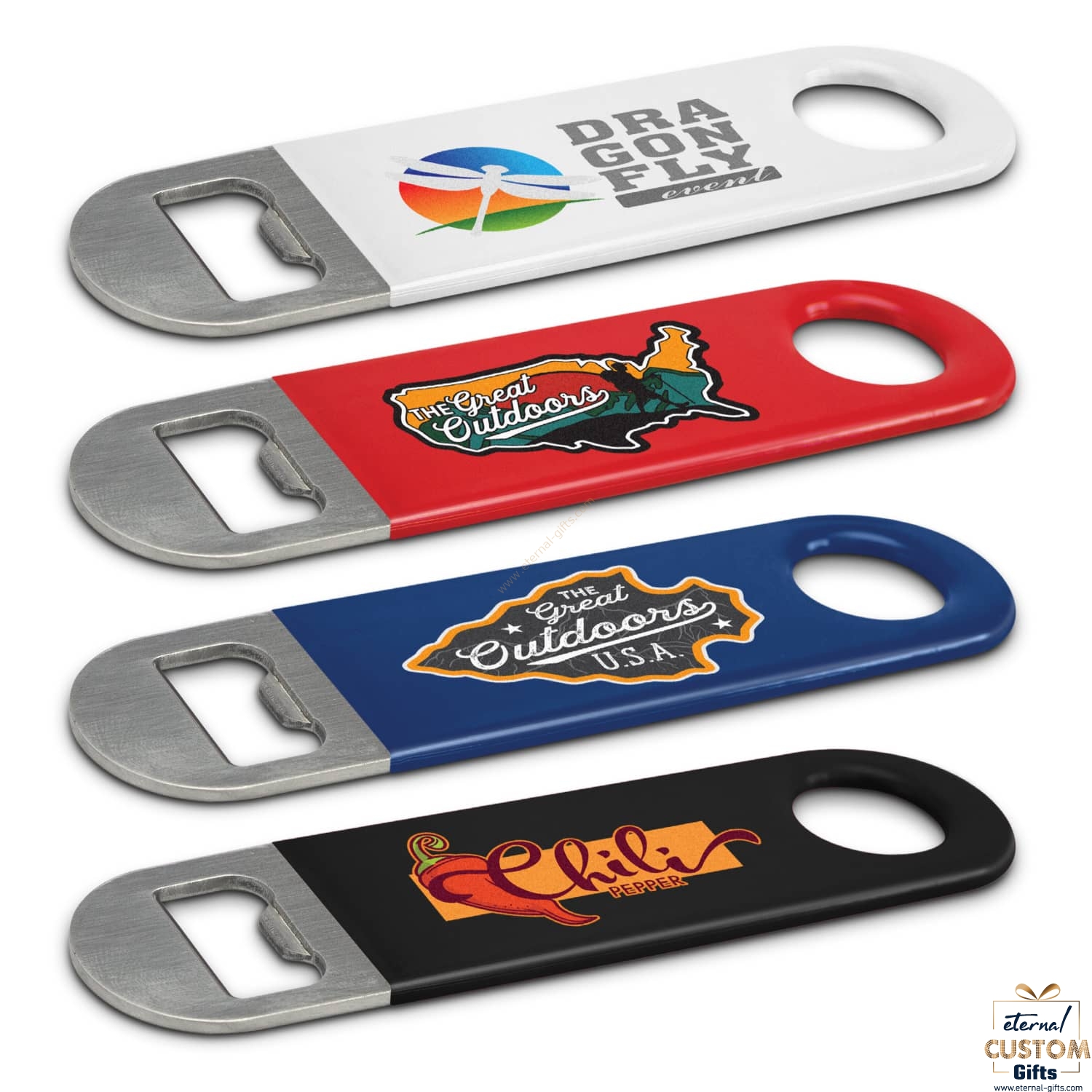 Small stainless steel bottle opener with a soft-touch vinyl coating.