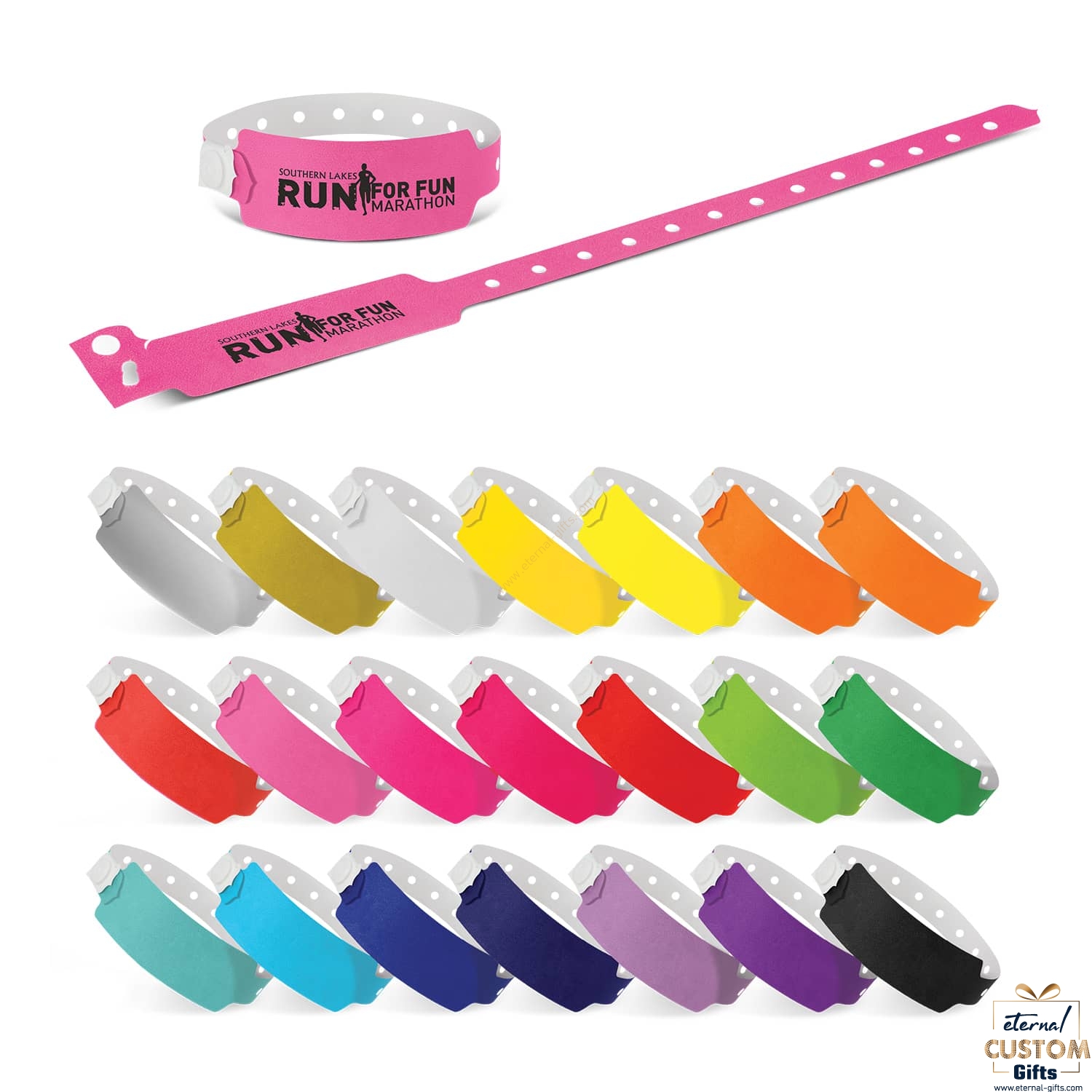 Tough tamperproof, snap lock wrist band manufactured from tri-laminate plastic which is waterproof and stretch-resistant. It is designed for crowd management at multi-day events, rugged outdoor events and events where water is involved. They are available either branded or unbranded in 21 different colours with optional custom numbering. A production lead time of 20 working days applies to this product by air freight and larger orders can be sea freighted on request to reduce the freight cost.