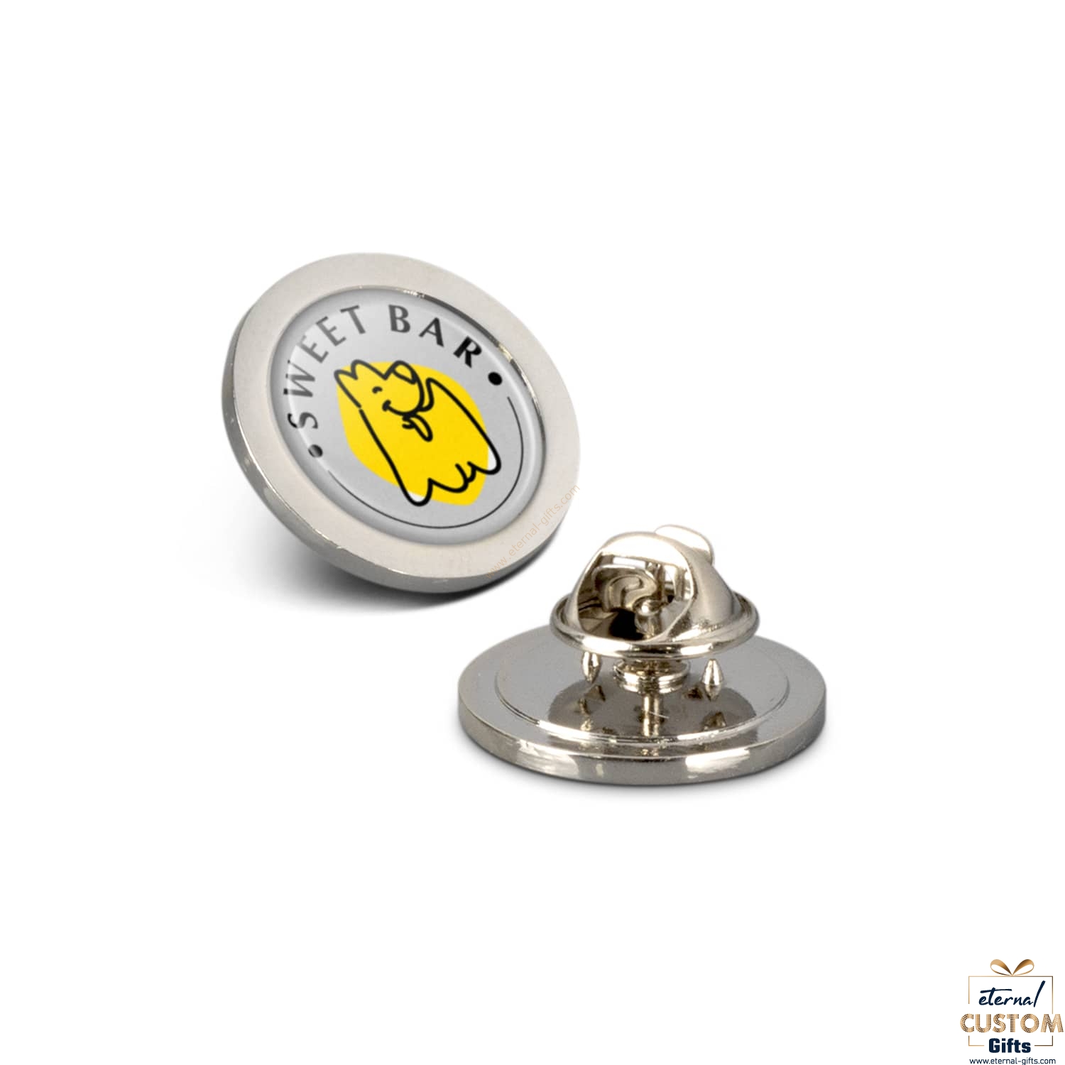Metal lapel pins which are available in six standard sizes and shapes. They can be branded in spot colours or full colour with a luxury resin coated finish.