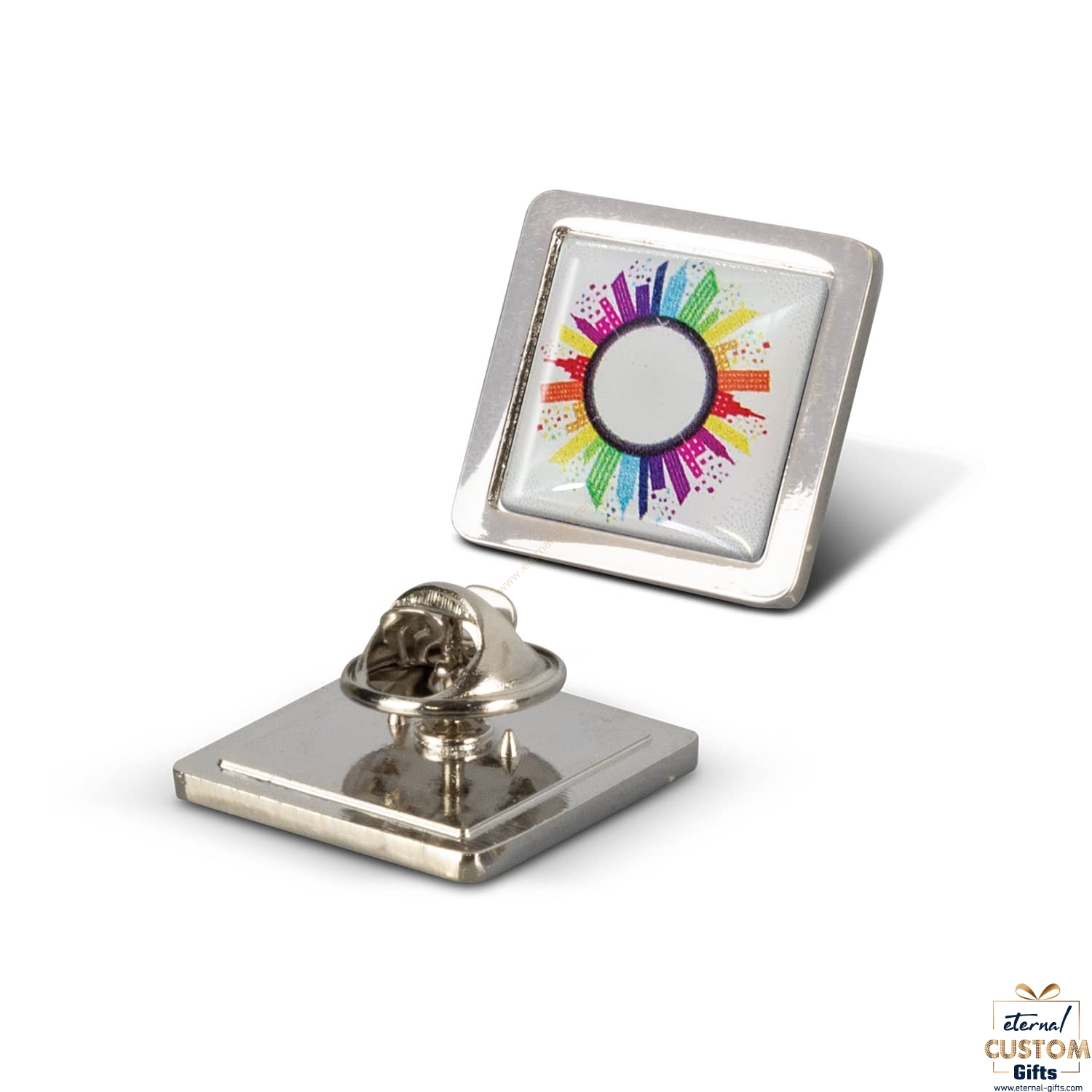 Metal lapel pins which are available in six standard sizes and shapes. They can be branded in spot colours or full colour with a luxury resin coated finish.