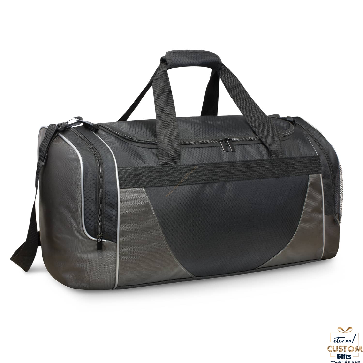 Superior large duffle bag which is manufactured from gunmetal coloured 600D polyester with decorative black ripstop nylon accents and smart silver piping. It has strong woven carry handles with a Velcro cuff and a woven shoulder strap which is adjustable and removable. Excelsior has two zippered external pockets, one of which is a shoe bag that can also be used for wet gym gear etc. Other features include an external mesh pocket, a sturdy internal base board and strong external plastic feet.