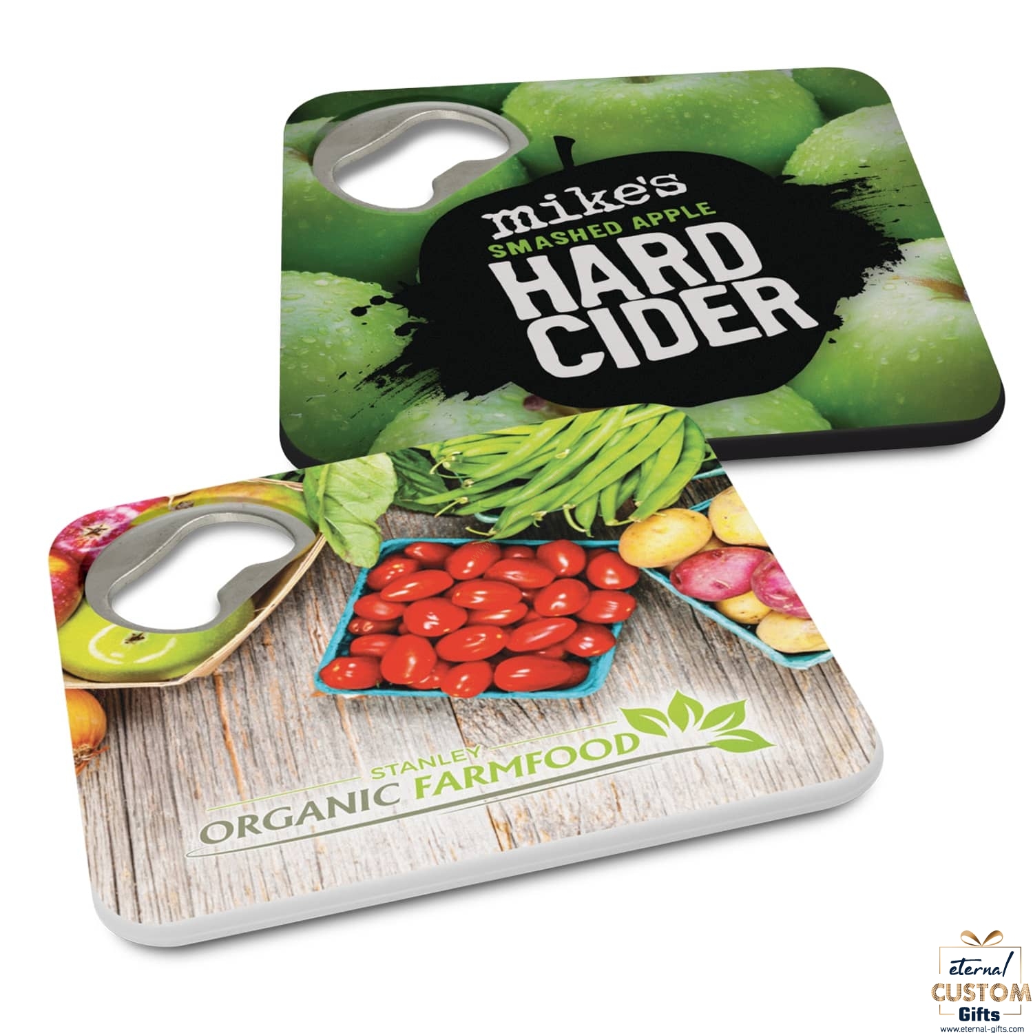 Handy plastic coaster with a built-in bottle opener. It has a soft non-slip and non-marking foam base.