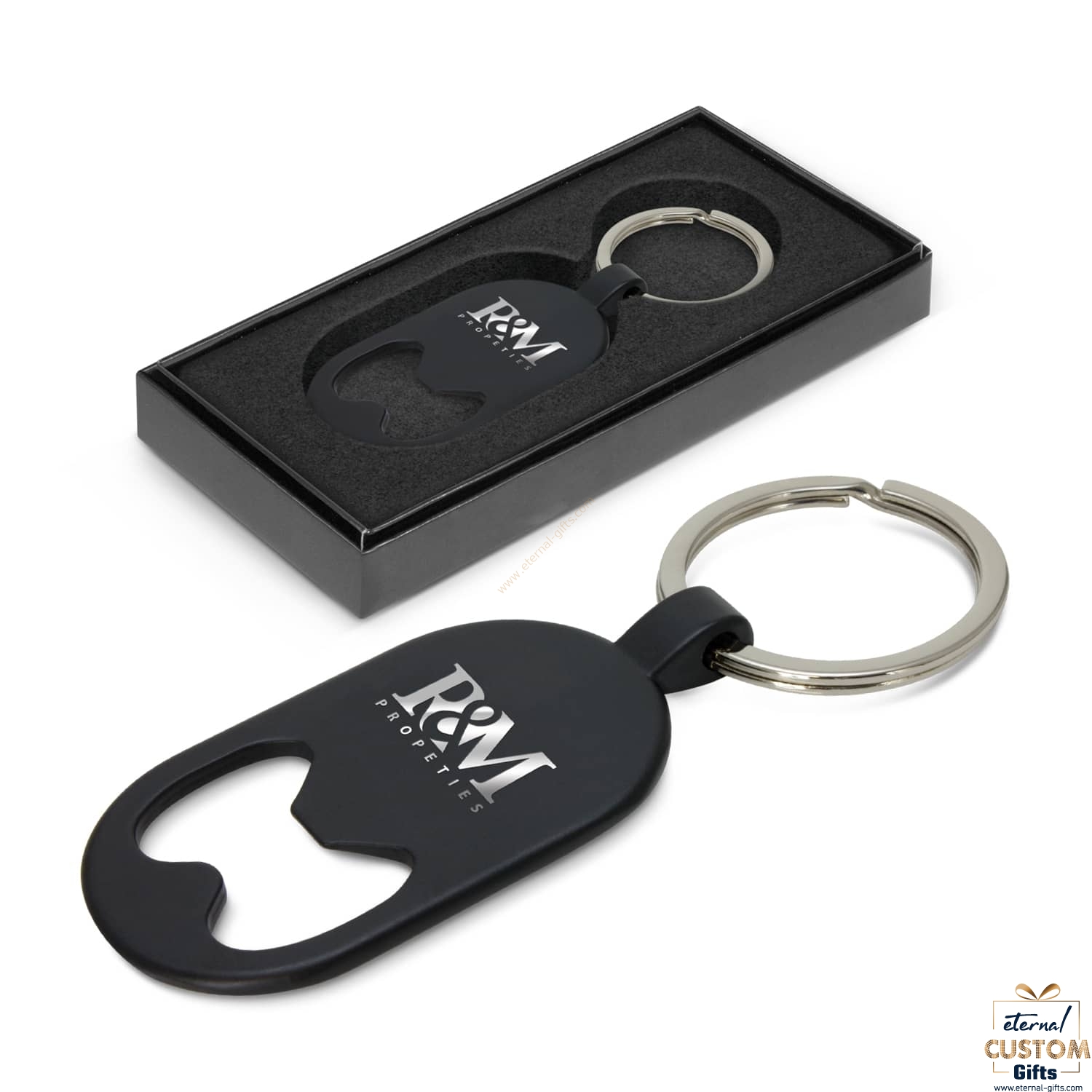 Metal bottle opener key ring with a matt finish which can be laser engraved to a silver mirror finish. It is beautifully presented in a black gift box.