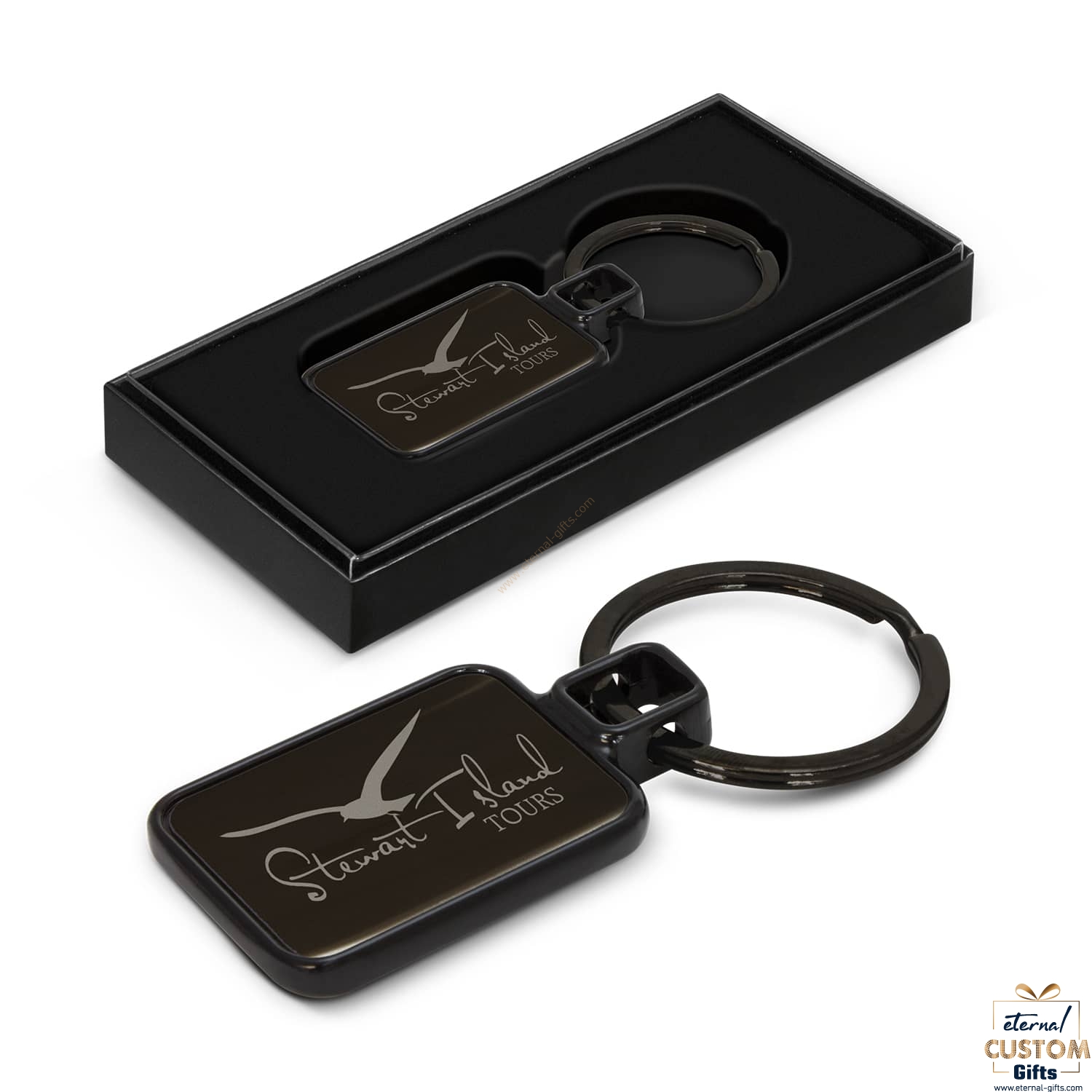 Metal rectangular key ring with a gunmetal plated finish on both sides which can be laser engraved to a natural etch. It is beautifully presented in a black gift box.