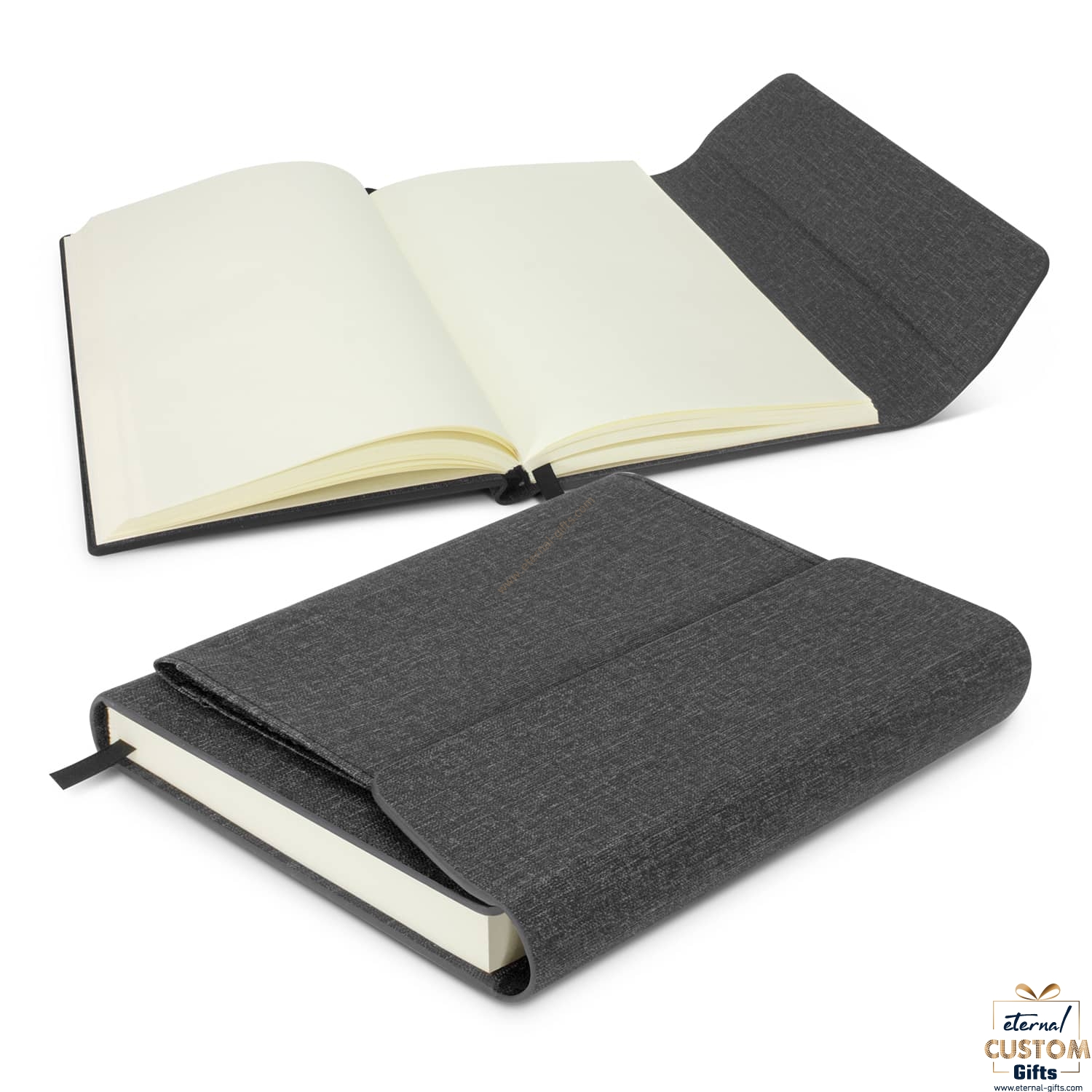 Outstanding medium-size notebook with a large reinforced pocket on the front which will hold a phone and other small items. It has a hard cover with a heather style PU finish and smart black stitching. The cover thermo debosses to a stunning two-tone finish. Stanford has a massive 160 leaves (320 pages) of 80gsm lined cream paper and a bookmark ribbon The notebook and pocket are securely sealed with a strong magnetic closure.