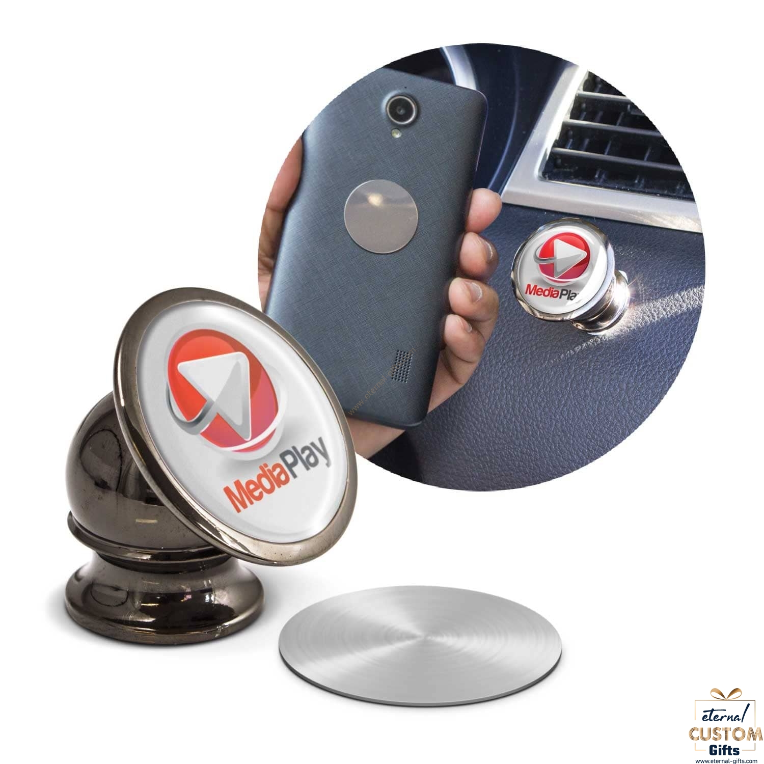 Multi-directional magnetic phone holder that attaches securely to a car dashboard to enable the phone to be used as a GPS. To establish the magnetic connection, a thin metal plate is attached to the phone or phone case. This is a proven concept which will not damage or affect the performance of the phone. Both the phone holder and the metal plate use strong 3M adhesive which wont leave marks if either is removed. Enzo is presented in a compact clear gift box along with two different size metal plates, spare adhesive circles, two surface cleaning pads and simple instructions.