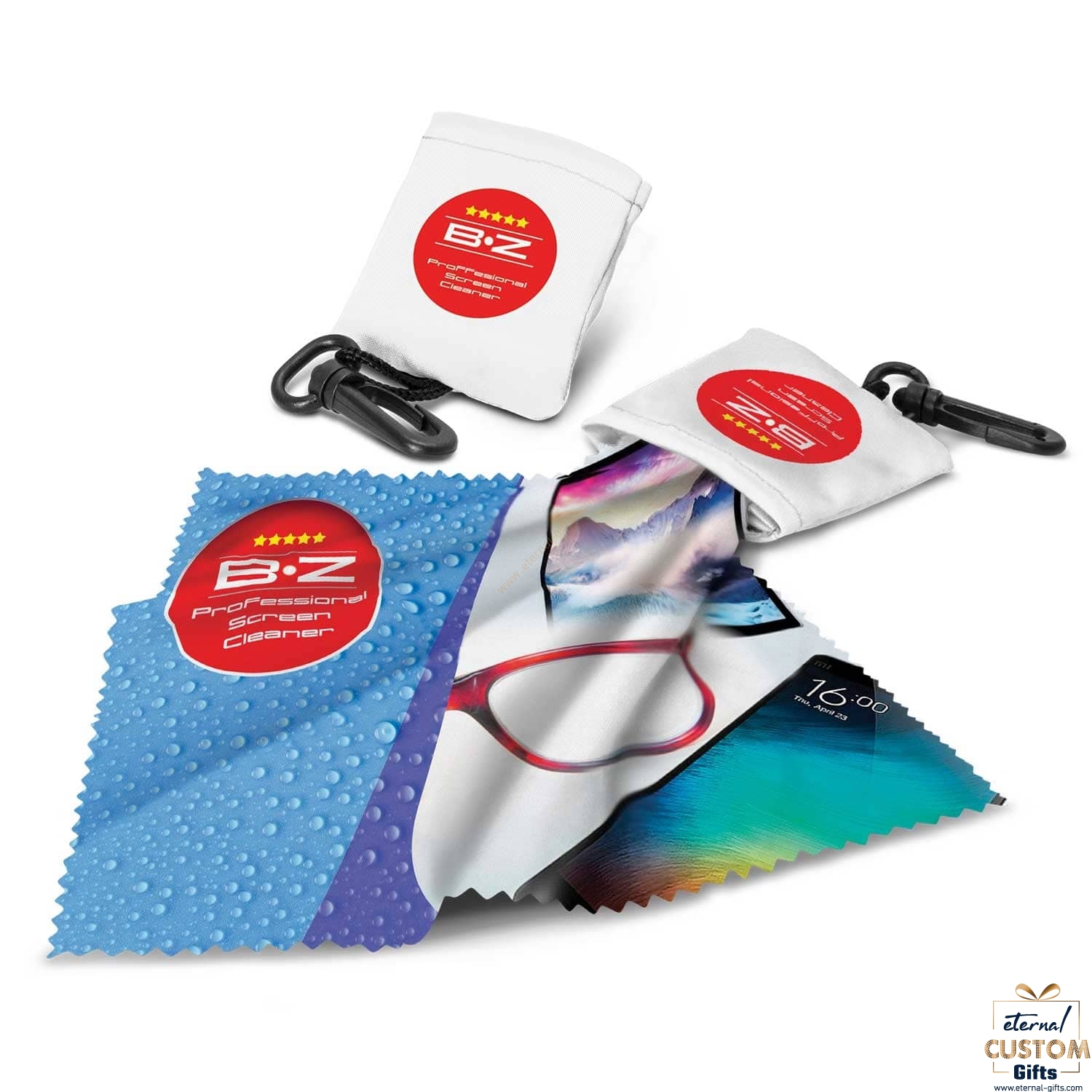 150mm square microfibre screen cleaning cloth which folds away into a compact pouch with a clip. It is ideal for attaching to a key ring or a bag so it is always available when needed. The screen cleaner is branded on one side in spot colours of full colour and the pouch is branded on both sides in spot colours or full colour. A production lead time of 20 working days applies to this product by air freight and larger orders can be sea freighted on request to reduce the freight cost.