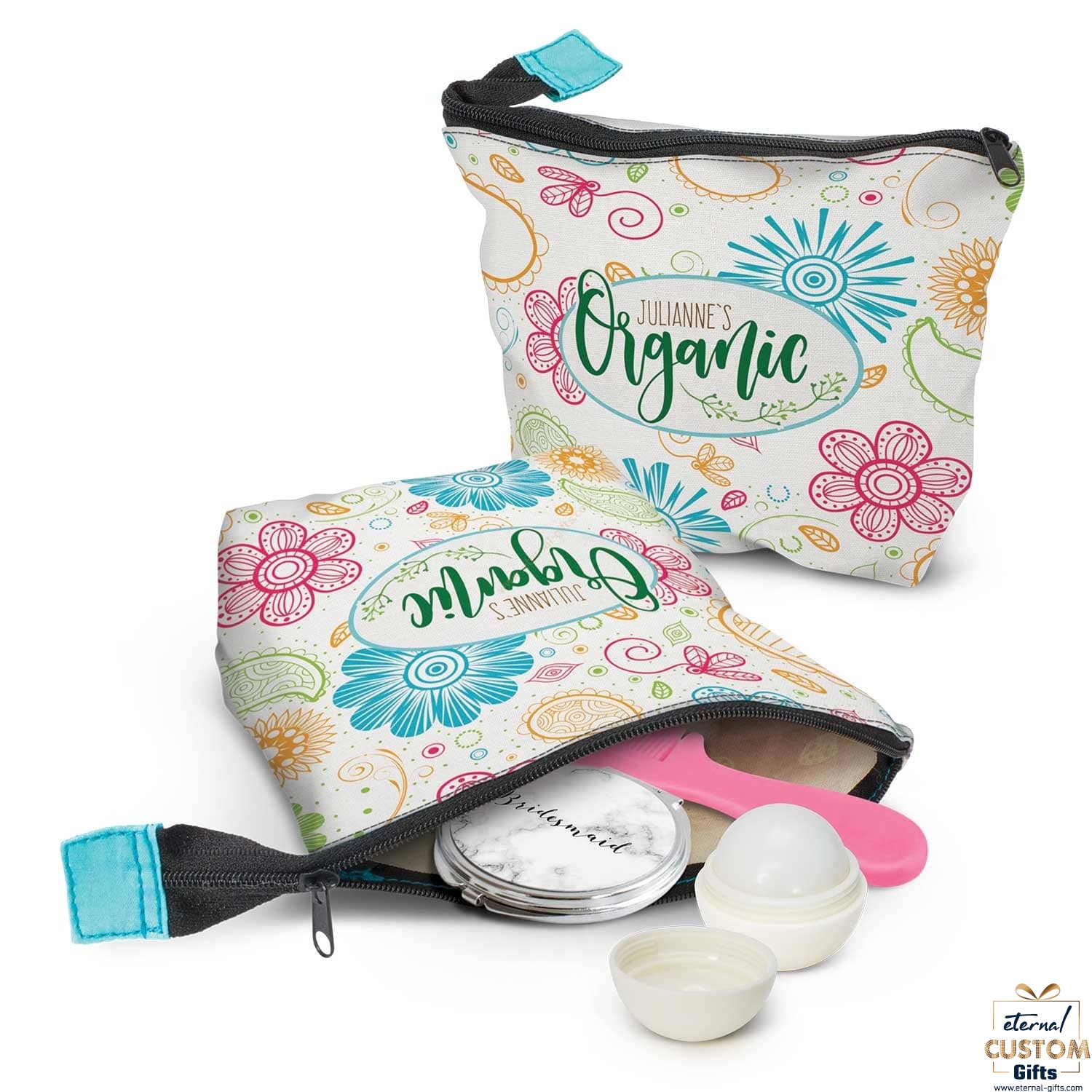 Petite cosmetic bag which is manufactured from 140gsm cotton and is branded in spot colour or full colour on both sides at no extra cost. It has a black zippered closure with a coloured tag on the end of the zip which is available in 16 colours. The stitching will match the coloured tag unless requested otherwise. A production lead time of 20 working days applies to this product by air freight and larger orders can be sea freighted on request to reduce the freight cost.