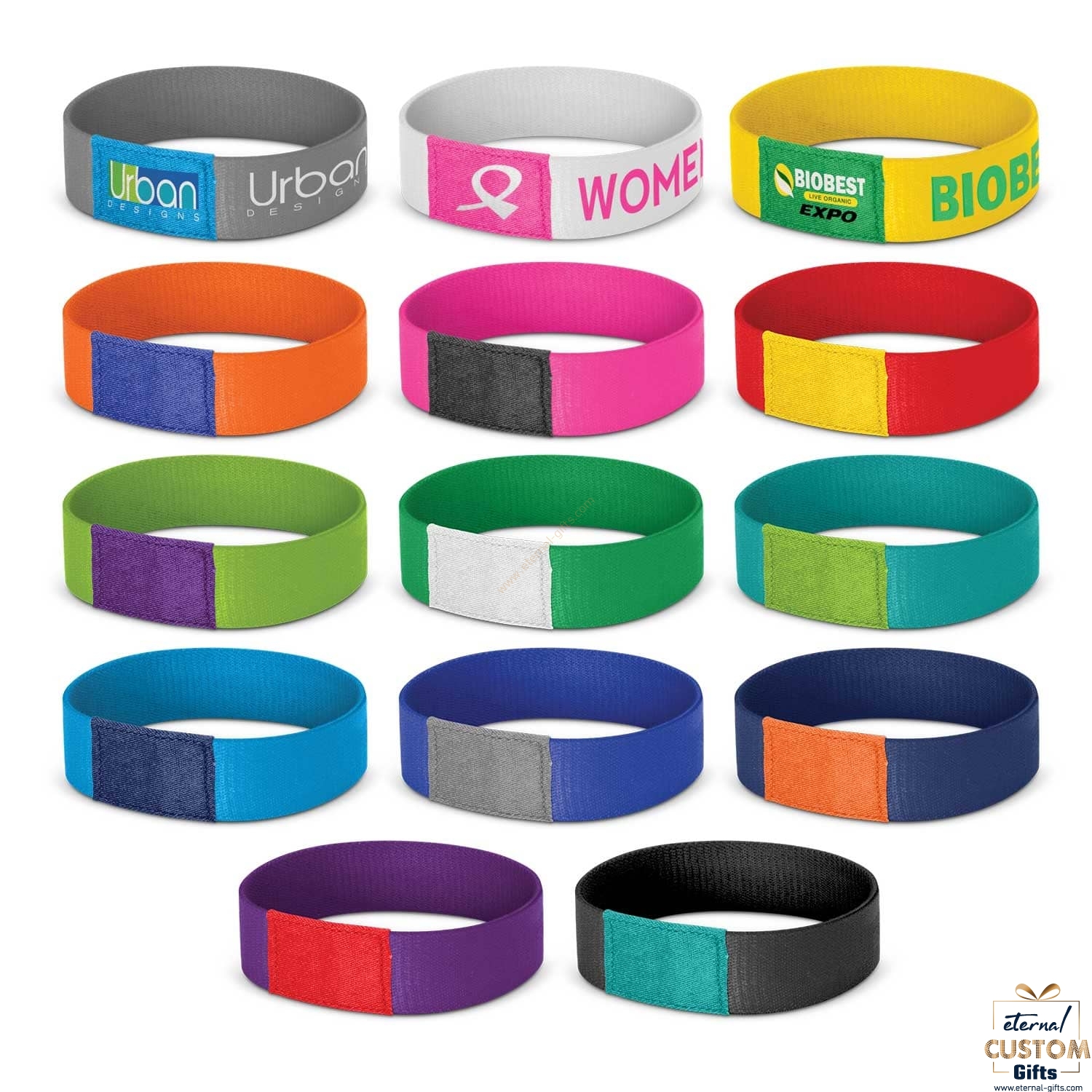 - Manufactured from soft elastic polyester and a contrasting closure band that can also be branded