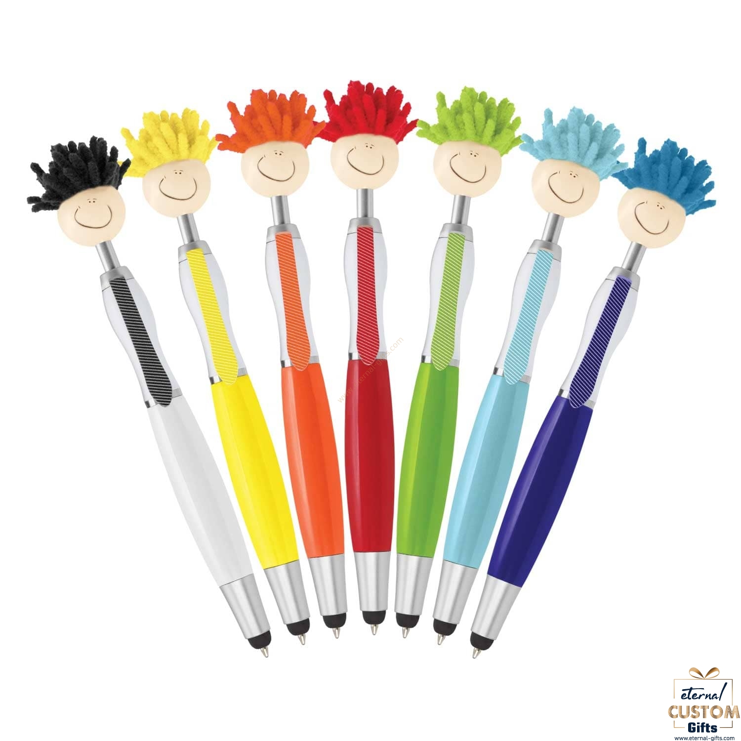 Fun retractable plastic and metal ballpoint pen with a smiley-faced head feature with microfibre hair which is used for cleaning screens, and a novel tie-shaped clip. Mop Topper has a stylus for use with touch screens and a black large volume refill with 800 metres of German manufactured Dokumental ink. It can be presented in an optional pen sleeve.