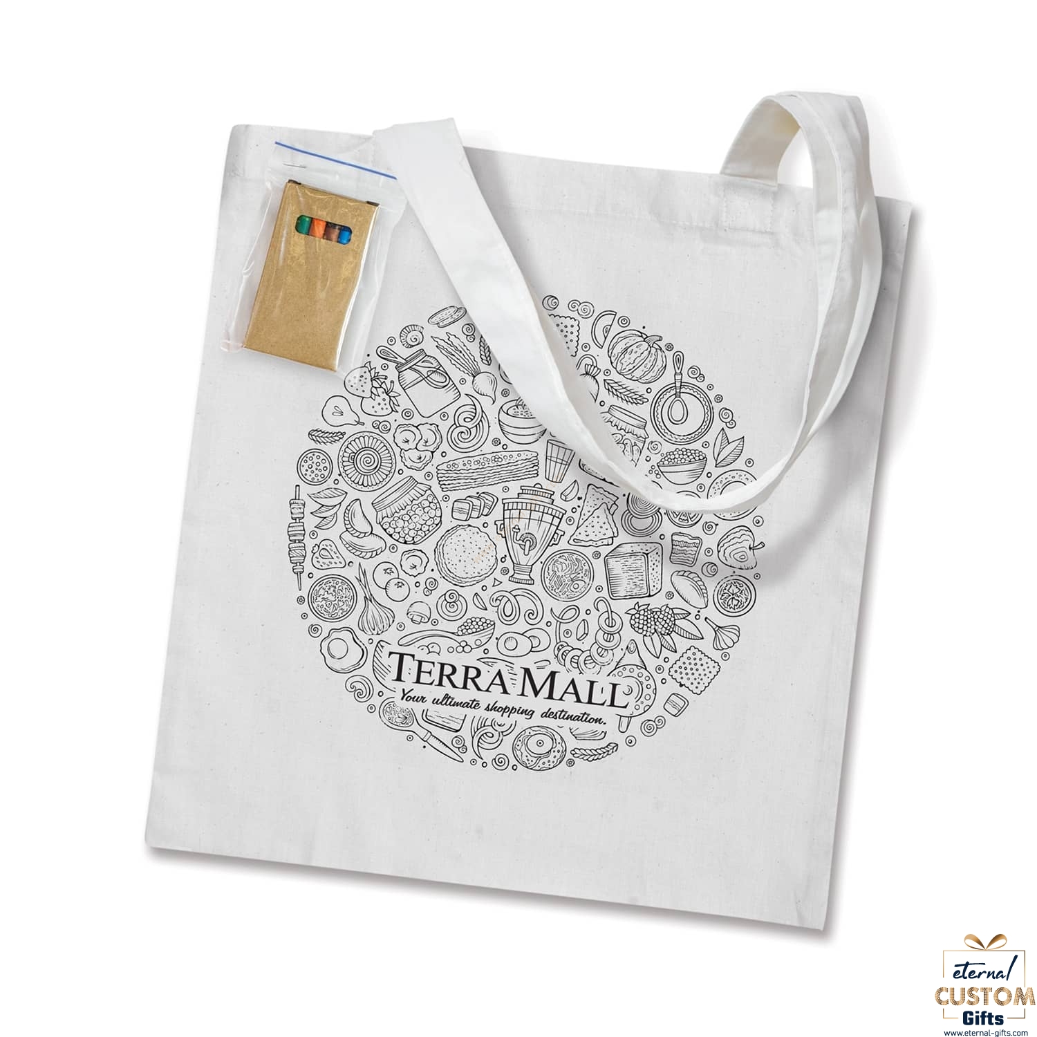 Reusable 135gsm cotton tote bag which is supplied with a packet of six non-toxic crayons. The bag can be branded with a customised design for colouring in. It is ideal as an interactive product for raising awareness or sell it as a fundraiser and run a competition.