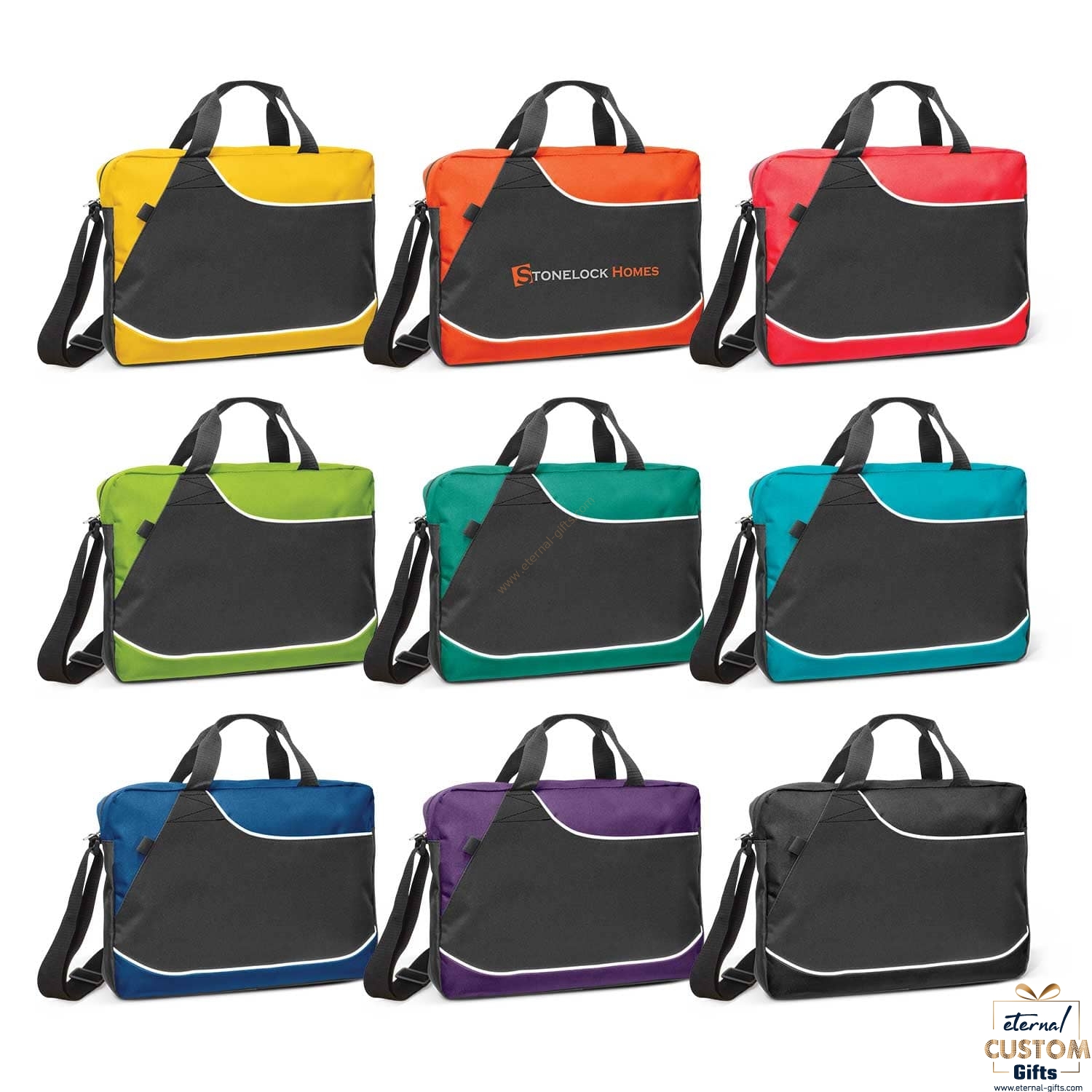Centrix combines superb design and functionality to produce a smart yet very affordable conference or business bag. It is manufactured from 600D polyester and has carry handles as well as an adjustable shoulder strap. Other features include a curved slip pocket on the front, a handy elastic pen loop, trendy white piping and a business card holder on the back.