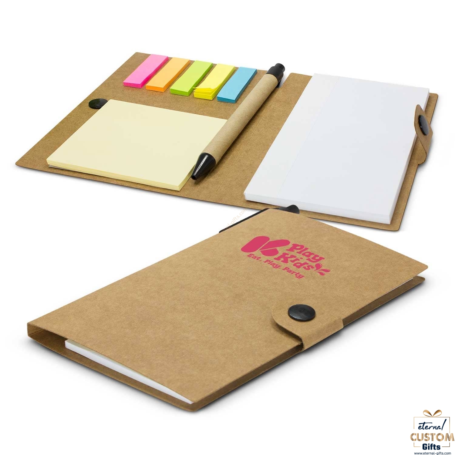 Pocket size multi-purpose notebook with an unbleached natural cardboard cover and a secure domed closure. It has a 50 leaf note pad, a 25 leaf pad of adhesive notes, five different coloured pads of adhesive flags and a Kraft Pen with a recycled cardboard barrel that slips neatly into the spine.