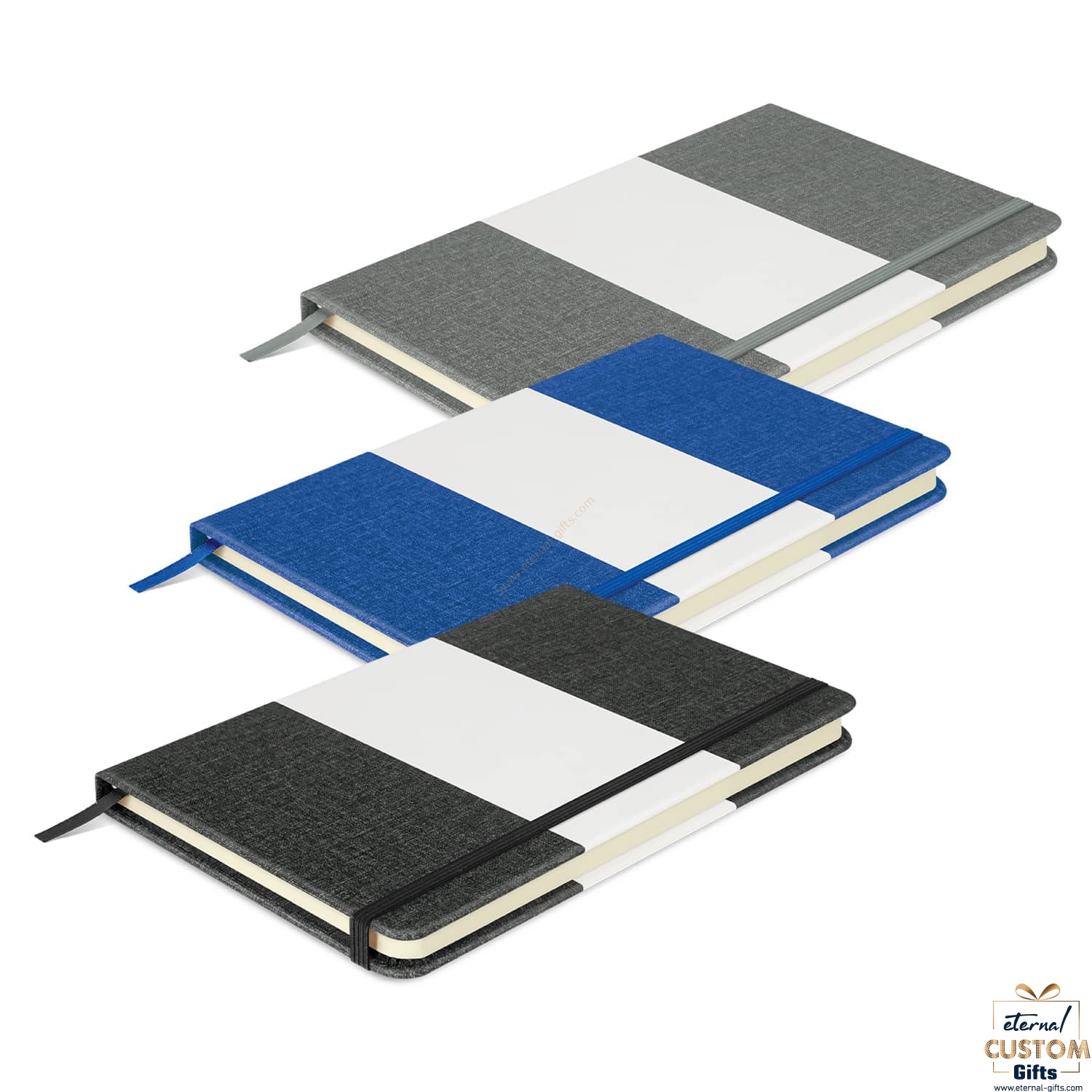 Medium-size notebook with an attention-grabbing hard cover which is finished with a stylish combination of heather style PU matched with leather-look white PU. It has 80 leaves (160 pages) of 80gsm lined cream paper with a bookmark ribbon and an elastic closure band. An optional paper belly band is available on request and can be branded in full colour.