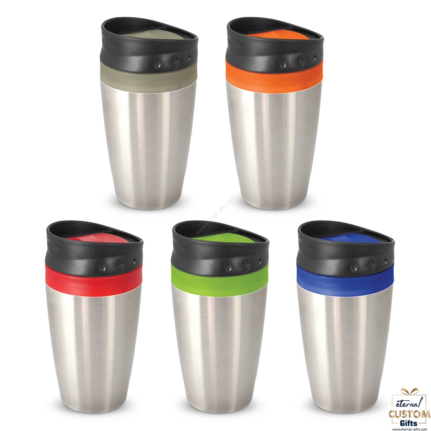 Impressive 400ml double wall cup which will keep coffee hot for longer. It has a stainless steel outer wall and a polypropylene inner wall. Octane has a secure screw on lid with a splashproof sliding closure and a soft non-marking base. It laser engraves to a natural etch and is BPA-free. This product is not dishwasher safe and handwashing is recommended.