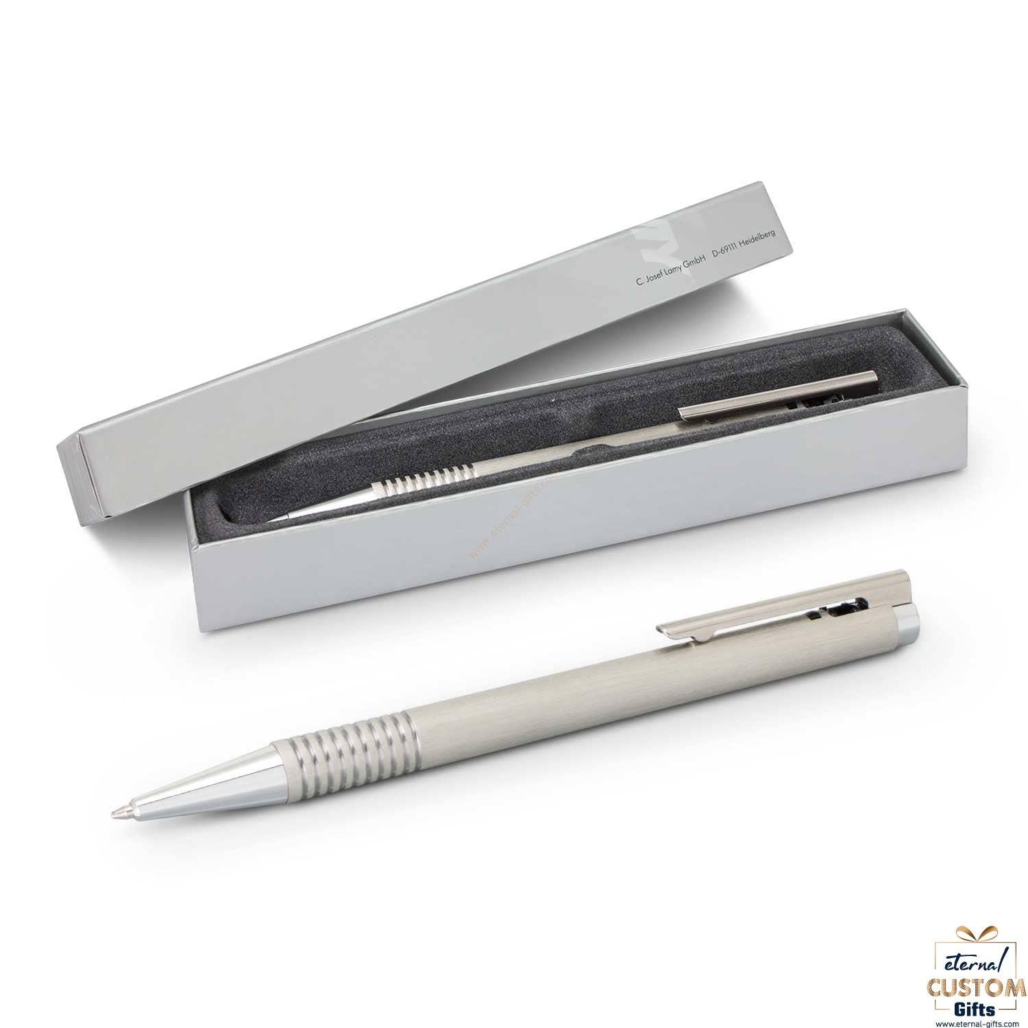 Timeless retractable ballpoint pen with a brushed stainless steel barrel. The pen has a finely tuned, spring-loaded metal clip and matching shiny chrome accents. It has a black LAMY M16 refill with 8000 metres of writing ink and is 100% made in Germany. The LAMY logo is engraved on the upper barrel and it is beautifully presented in a LAMY gift box.