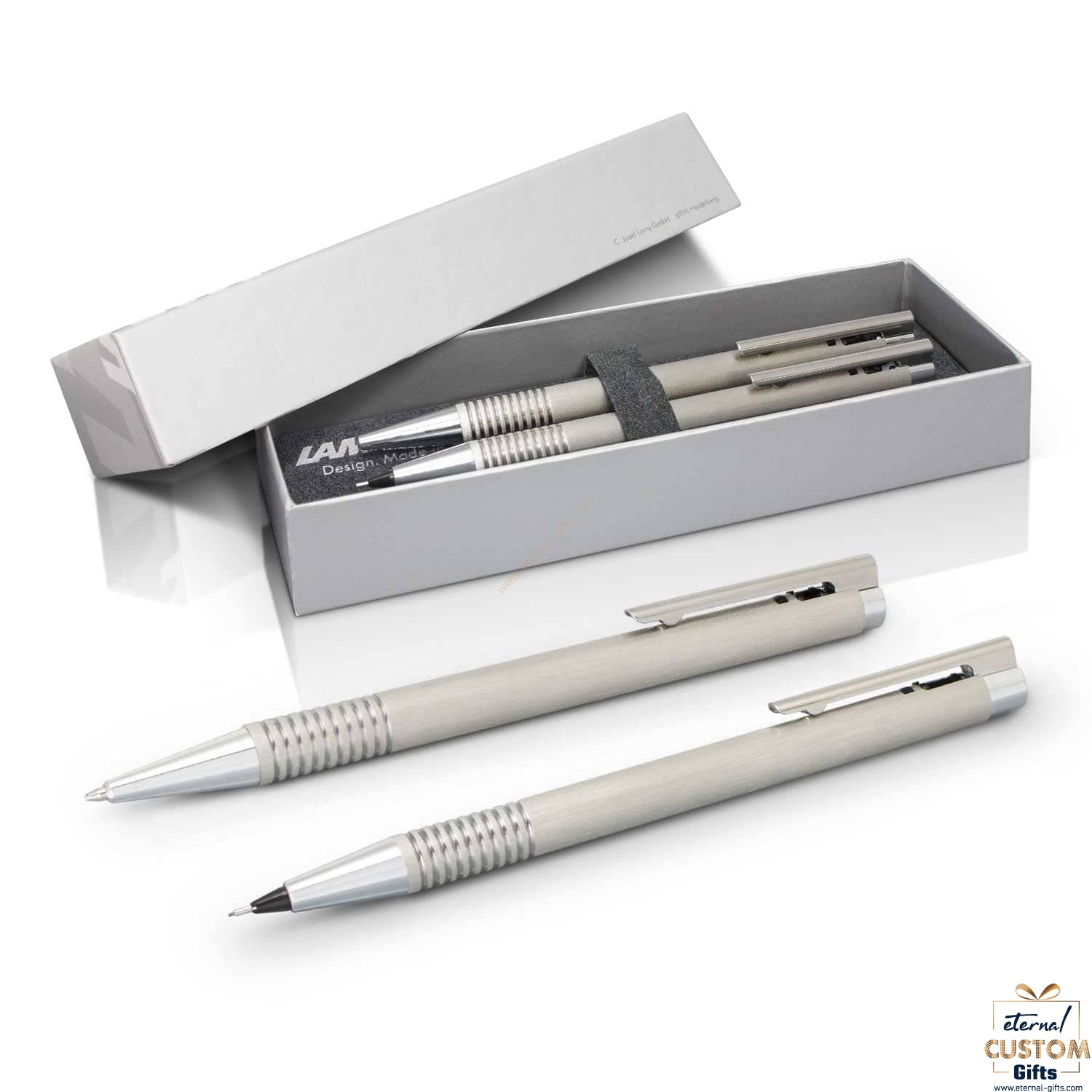 Superb pen and pencil set featuring a brushed stainless steel retractable ball pen delightfully partnered with a matching mechanical pencil. Both have a finely tuned, spring-loaded metal clip and matching shiny chrome accents. The ball pen has a black LAMY M16 refill with 8000 metres of writing ink and a tungsten carbide ball for improved writing quality. The pencil has a 0.5mm LAMY M41 HB lead refill and both barrels laser engrave to a natural etch. Logo is 100% made in Germany with the LAMY brand tastefully inscribed on the upper barrel and the set is beautifully presented in a LAMY gift box.
