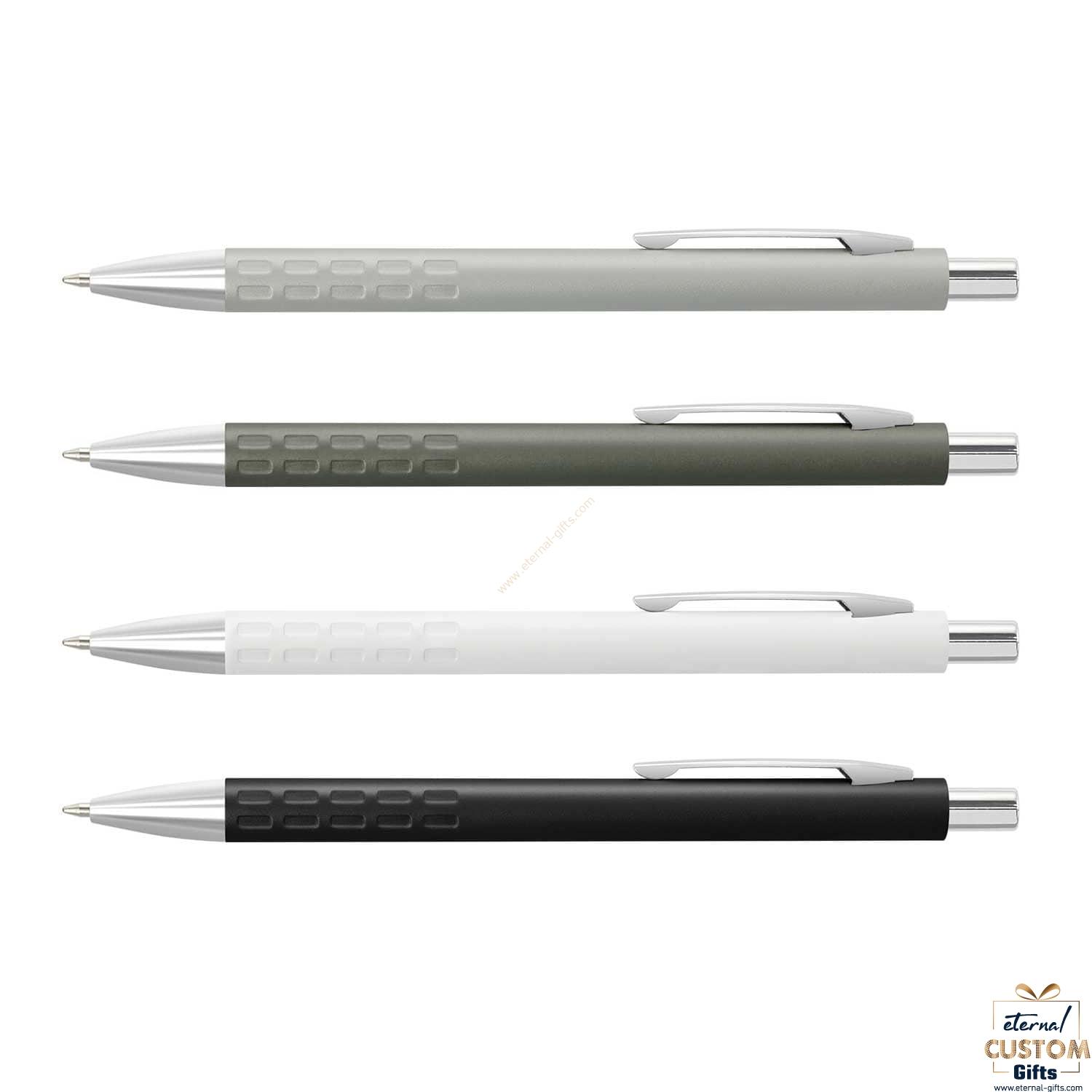 Retractable aluminium ballpoint pen with a debossed pattern on the grip, a matte lacquered barrel and shiny chrome accents. It has a blue large volume refill with 800 metres of writing ink and can be presented in an optional black pen sleeve.