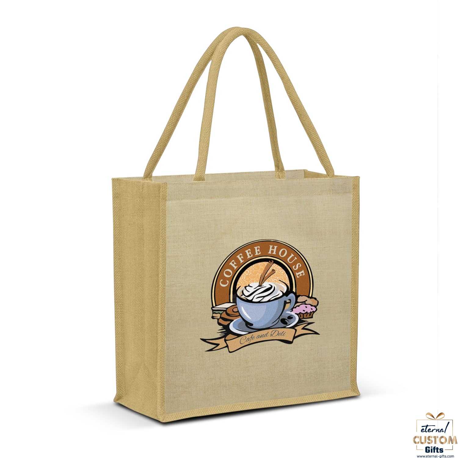 Classic laminated juco tote bag which has a large jute gusset and soft padded cotton handles. Juco is a versatile and increasingly popular new fabric that is manufactured from a fine blend of natural jute and natural cotton.