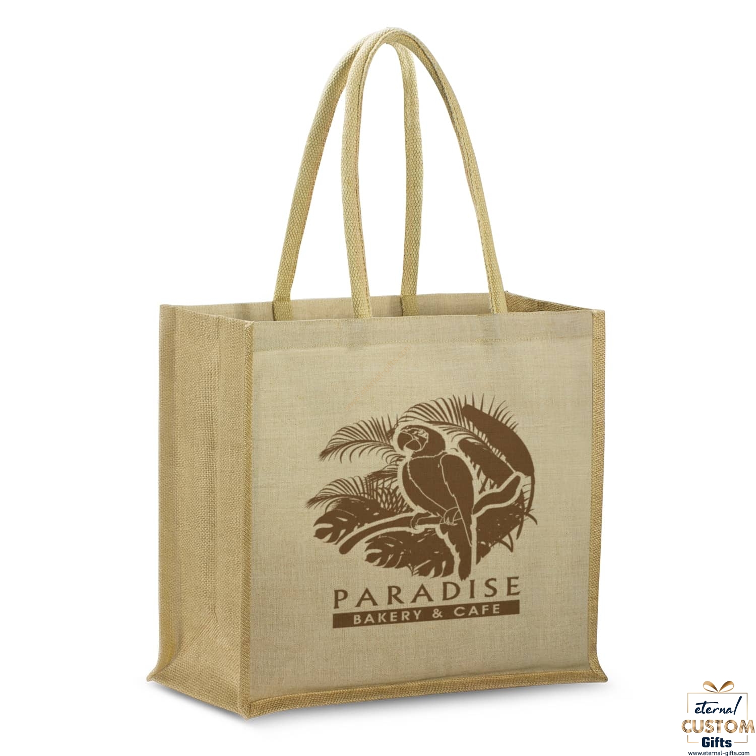 Extra-large laminated juco tote bag with a jute gusset and base which has padded cotton handles. Juco is a versatile and increasingly popular new fabric that is manufactured from a fine blend of natural jute and natural cotton.