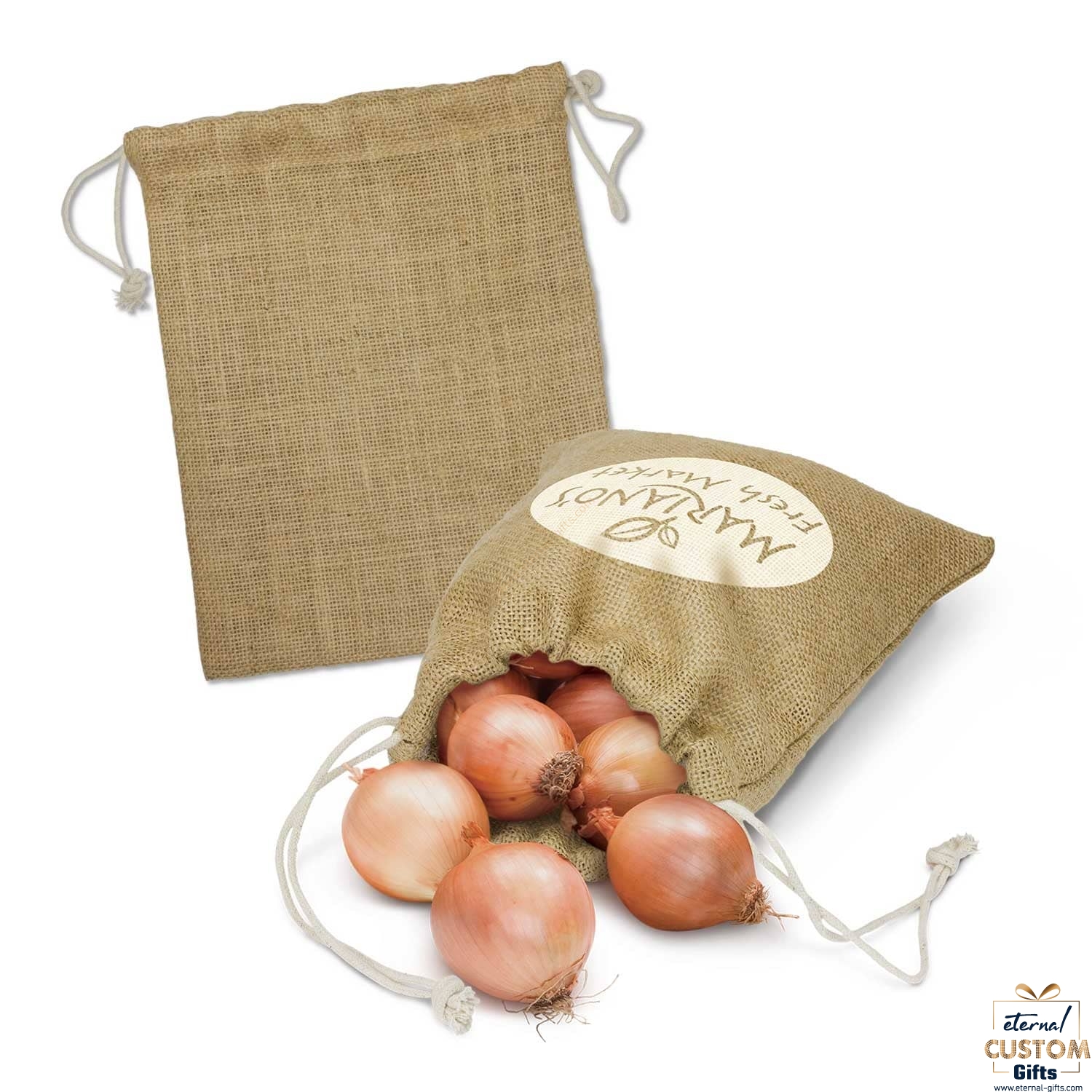 Reusable jute bag with a drawstring closure which is ideal for transporting and storing heavier produce from farmers markets and supermarkets. Jute is a strong, natural fibre which allows produce to breathe so it is always in the best possible condition and can be reused many times, replacing the need for single-use plastic bags.