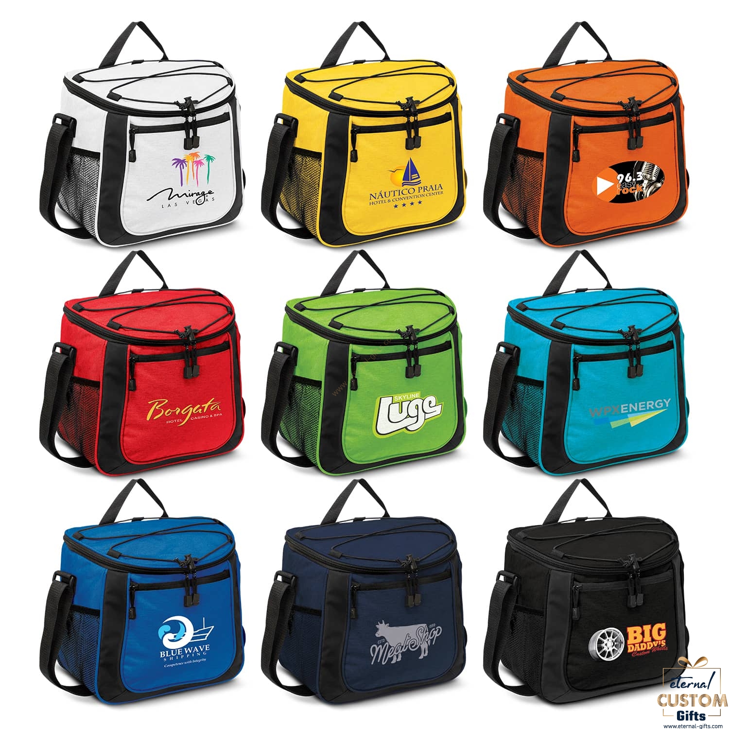 Impressive 13L cooler bag with thick PE foam insulation encased in a water-resistant PEVA inner liner. The outer construction is 600D polyester with a large zippered front pocket and two mesh side pockets. Other features include a zippered top closure, smart zipper pulls, a woven carry handle and trendy elastic lacing which is ideal for holding a sweater or light jacket.