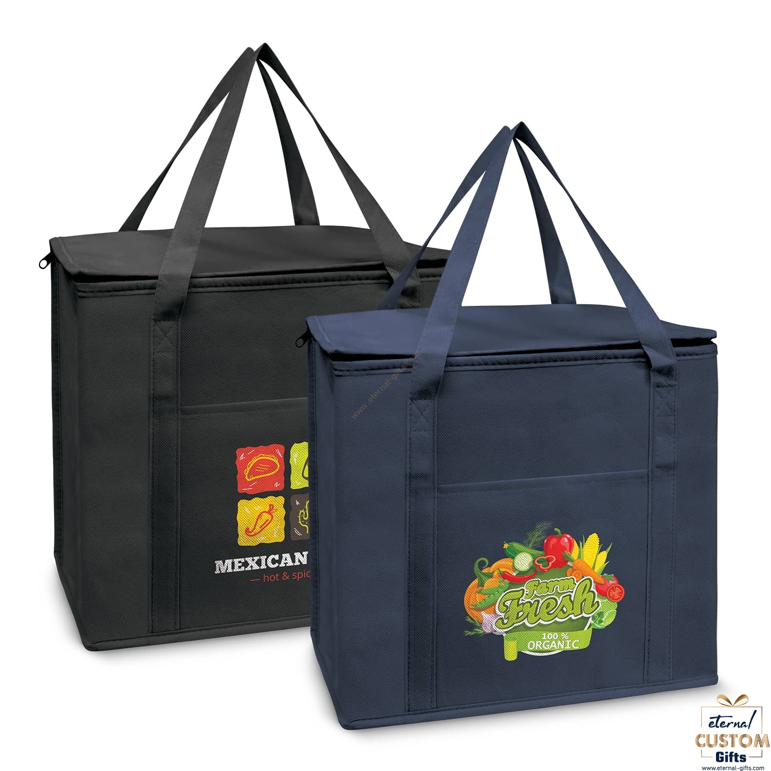 Classic supermarket style 19L cooler bag which is manufactured from 80gsm non-woven material with aluminium foil laminated PE foam insulation. It has a zippered top closure, reinforced handles and a large front slip pocket.