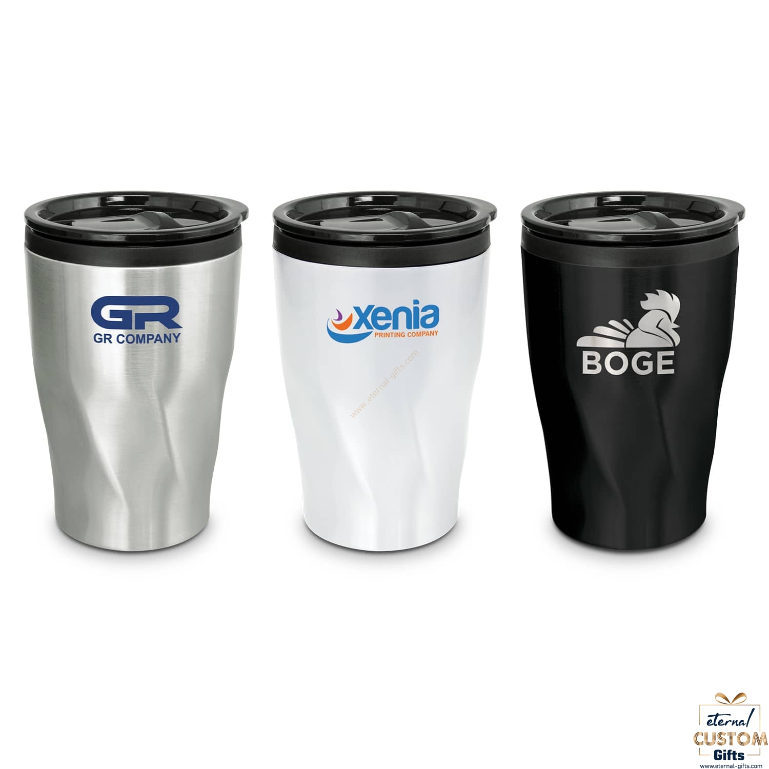 BPA-free 400ml double wall coffee cup which will keep drinks hot for longer. It features a radical twist patterned stainless steel outer wall and a polypropylene inner wall. Tornado has a secure plastic push on lid with a splashproof sliding closure and a soft non-marking base. The black and white cups laser engrave to a shiny steel finish and the silver cups engrave to a natural etch. This product is not dishwasher safe and handwashing is recommended.