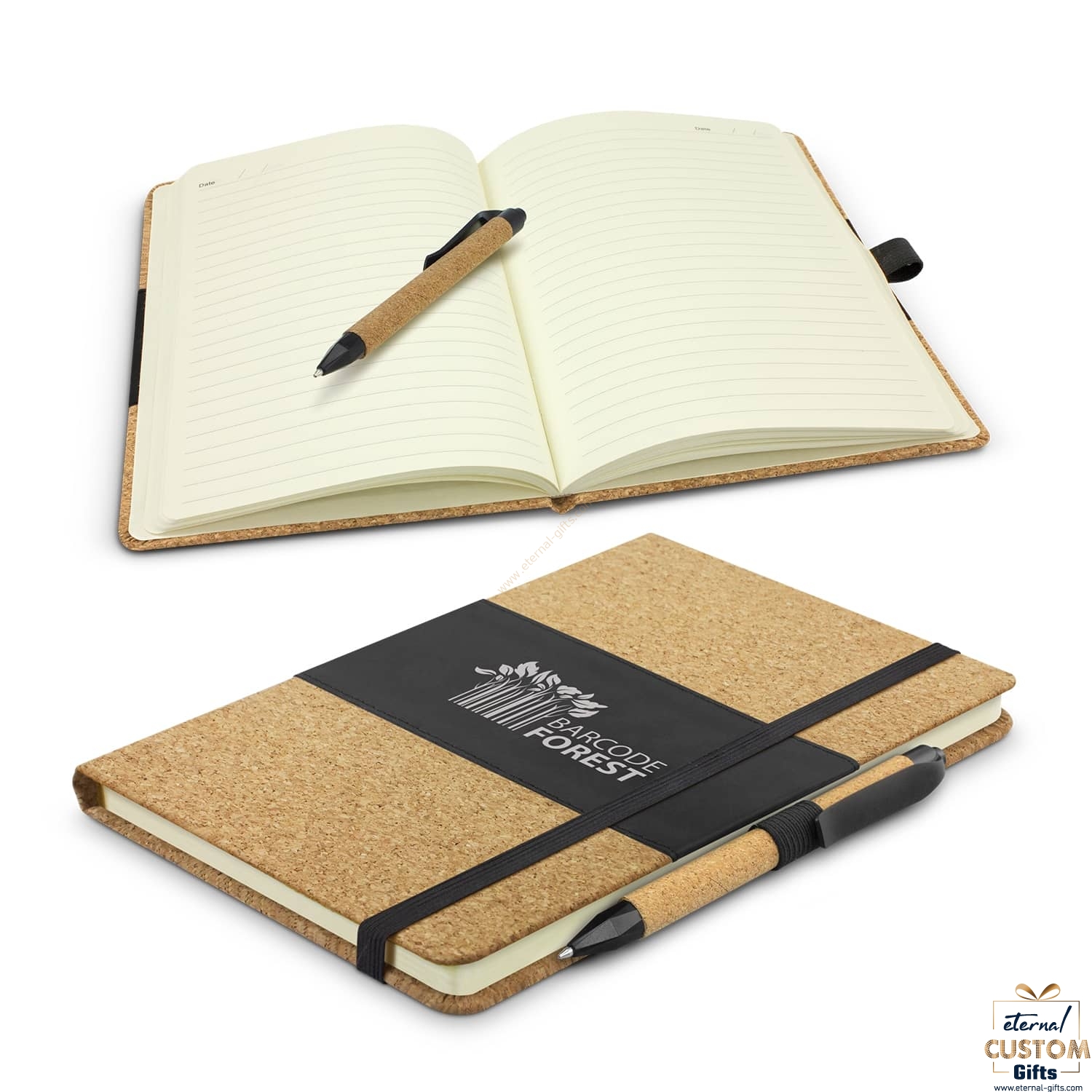 Medium-size notebook with a hard cover which is finished with a stylish combination of on trend natural cork and smooth PU. It has 80 leaves (160 pages) of 70gsm lined cream paper, an elastic closure band and an elastic pen loop which holds a matching retractable ball pen with a cork barrel. The pen has a black refill with 1000 metres of German manufactured Dokumental ink and a tungsten carbide ball for improved writing quality.