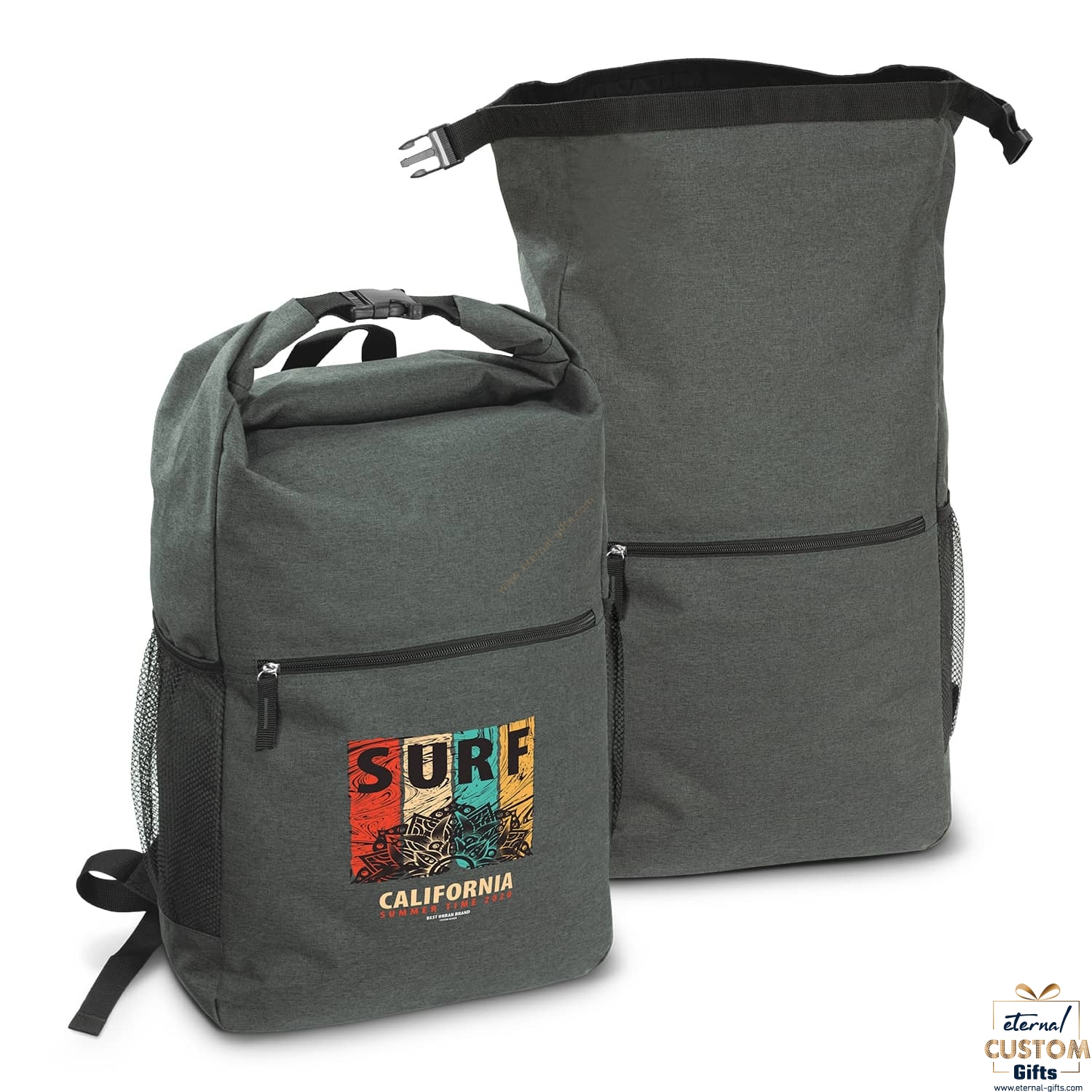 Large backpack which is manufactured from smart 300D polyester with a padded 600D polyester back panel for comfortable carrying. It has 210D polyester lining and a roll top closure with a secure snap lock. Other features include an internal slip pocket that fits a 17 inch laptop or a tablet, a large zippered external pocket, two mesh side pockets, a carry handle and adjustable shoulder straps which are padded.