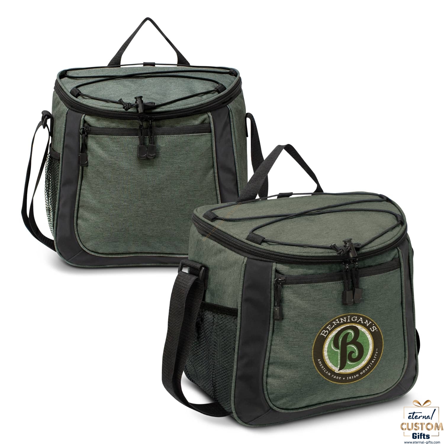 Elite cooler bag with thick PE foam insulation encased in a water-resistant PEVA inner liner. The outer construction is premium heather style poly-canvas with a large zippered front pocket and two mesh side pockets. Other features include a zippered top closure, smart zipper pulls, a woven carry handle and trendy elastic lacing which is ideal for holding a sweater or light jacket.