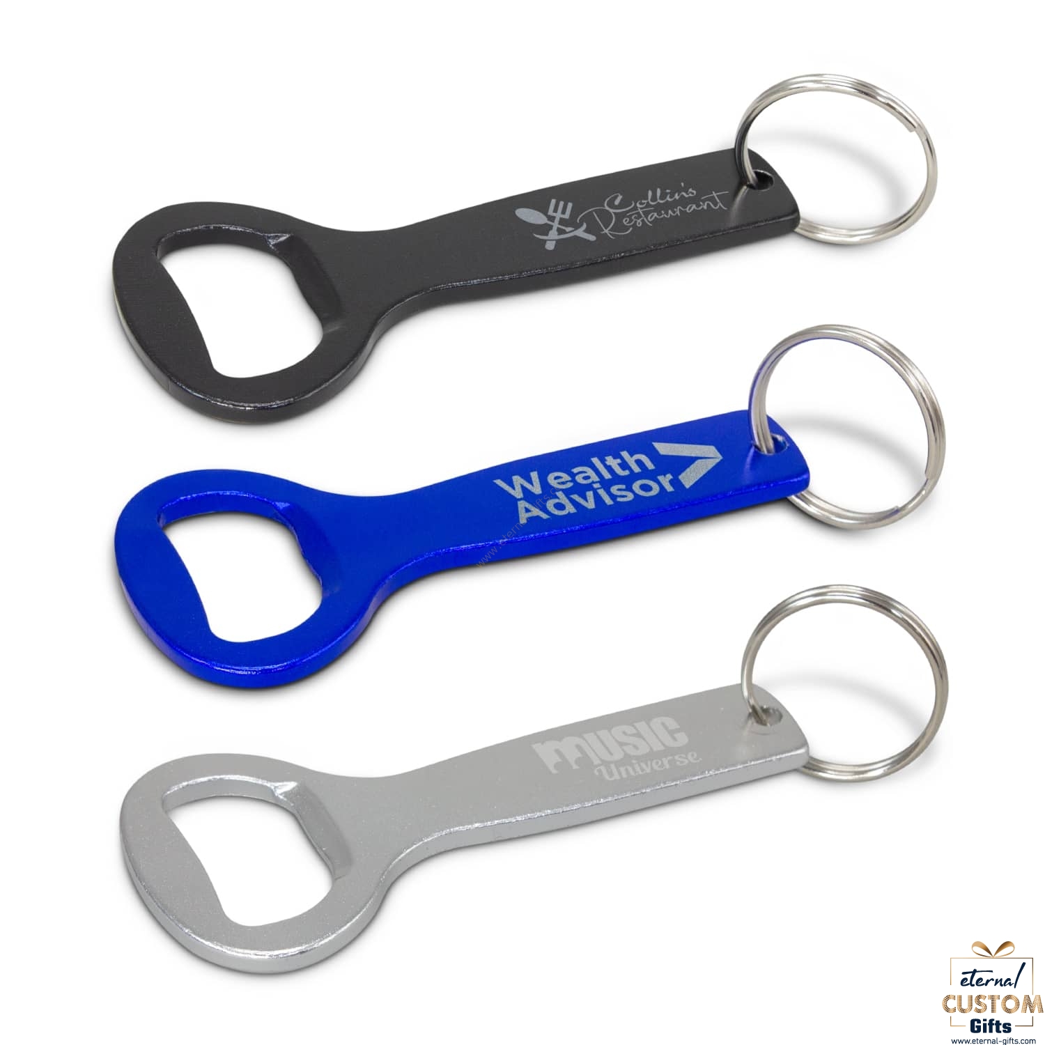 Strong aluminium bottle opener with a key ring. It laser engraves to an oxidised white colour.